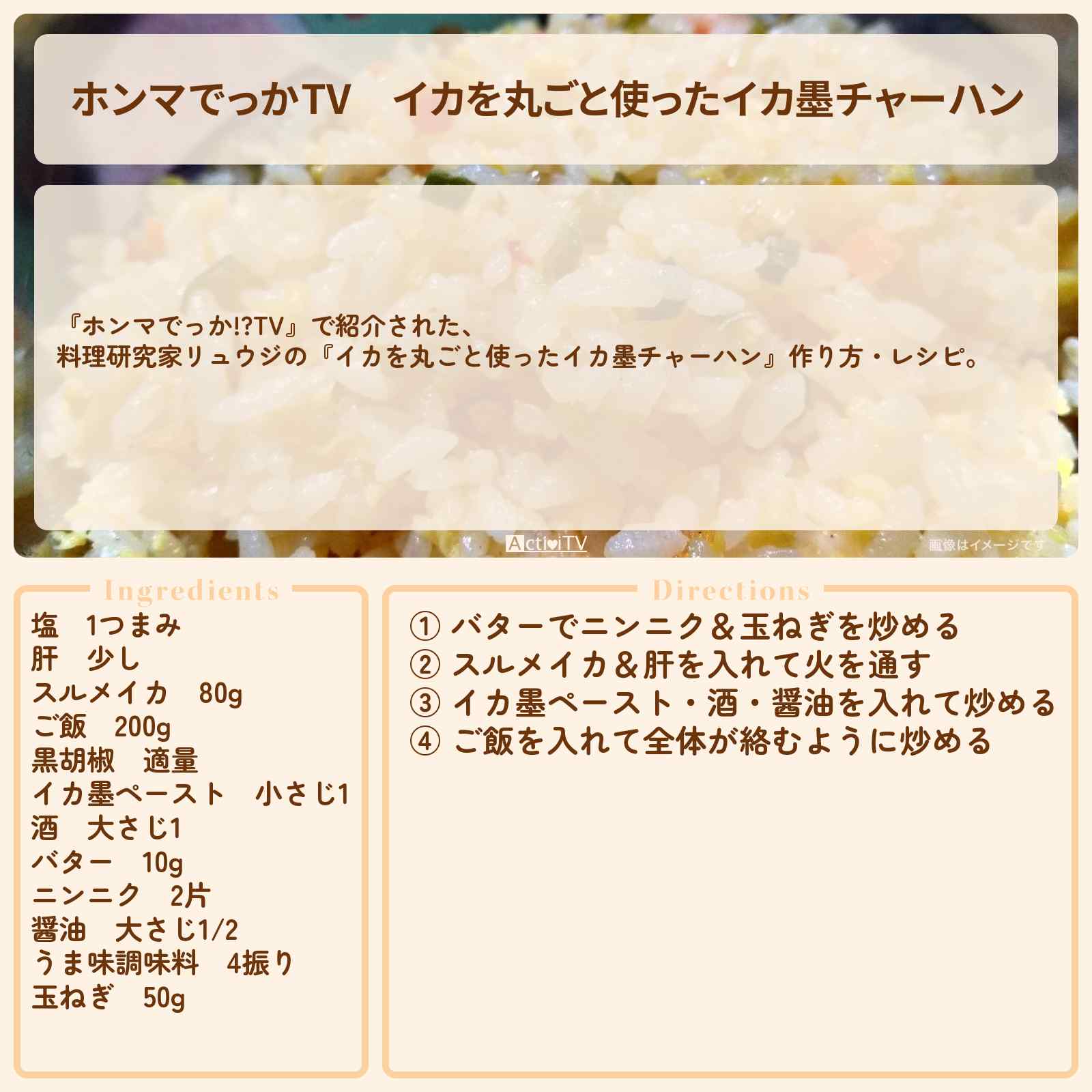 (水)放送の【ホンマでっか!?TV】で紹介された、料理研究家リュウジの『イカを丸ごと使ったイカ墨チャーハン』作り方・レシピ。