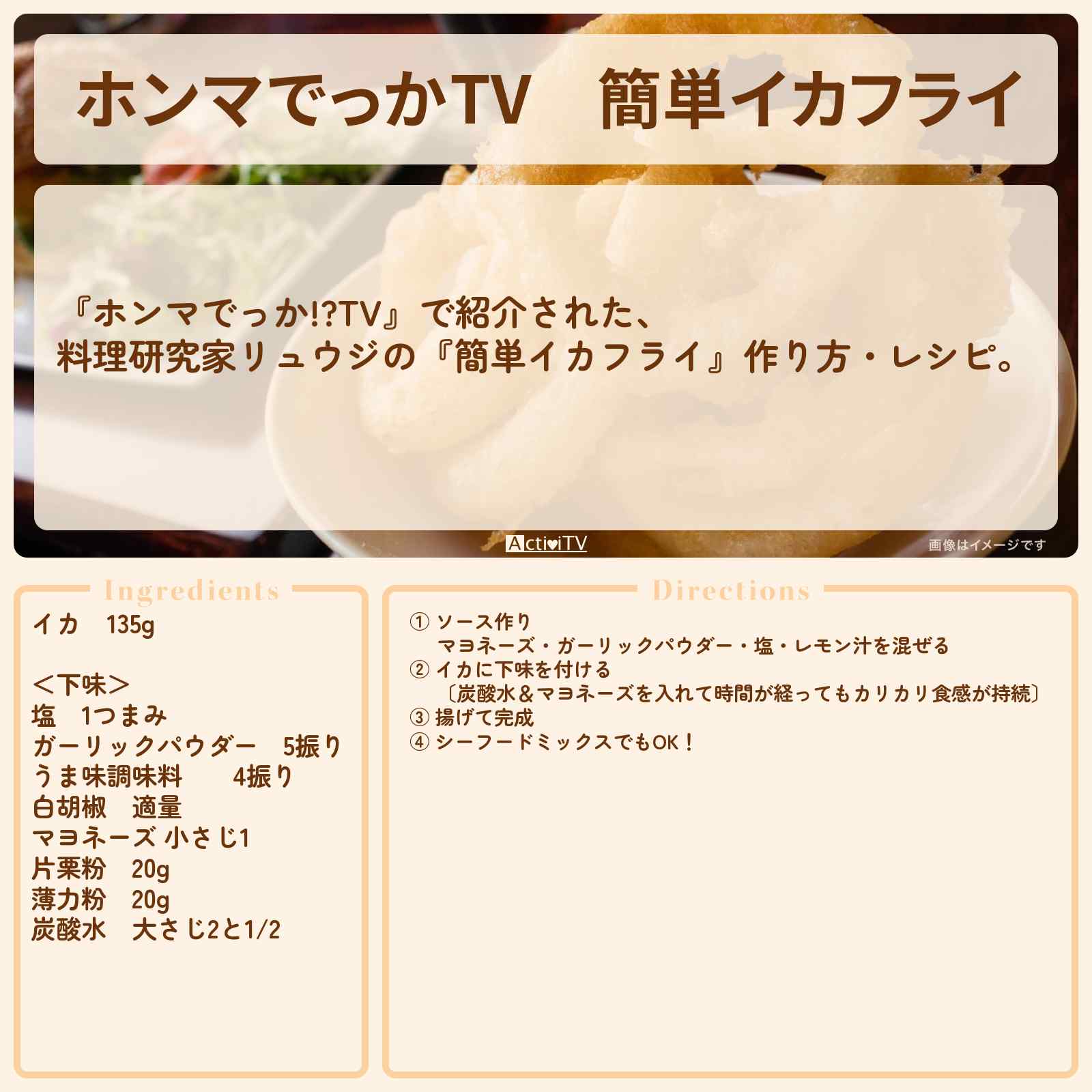 (水)放送の【ホンマでっか!?TV】で紹介された、料理研究家リュウジの『簡単イカフライ』作り方・レシピ。
