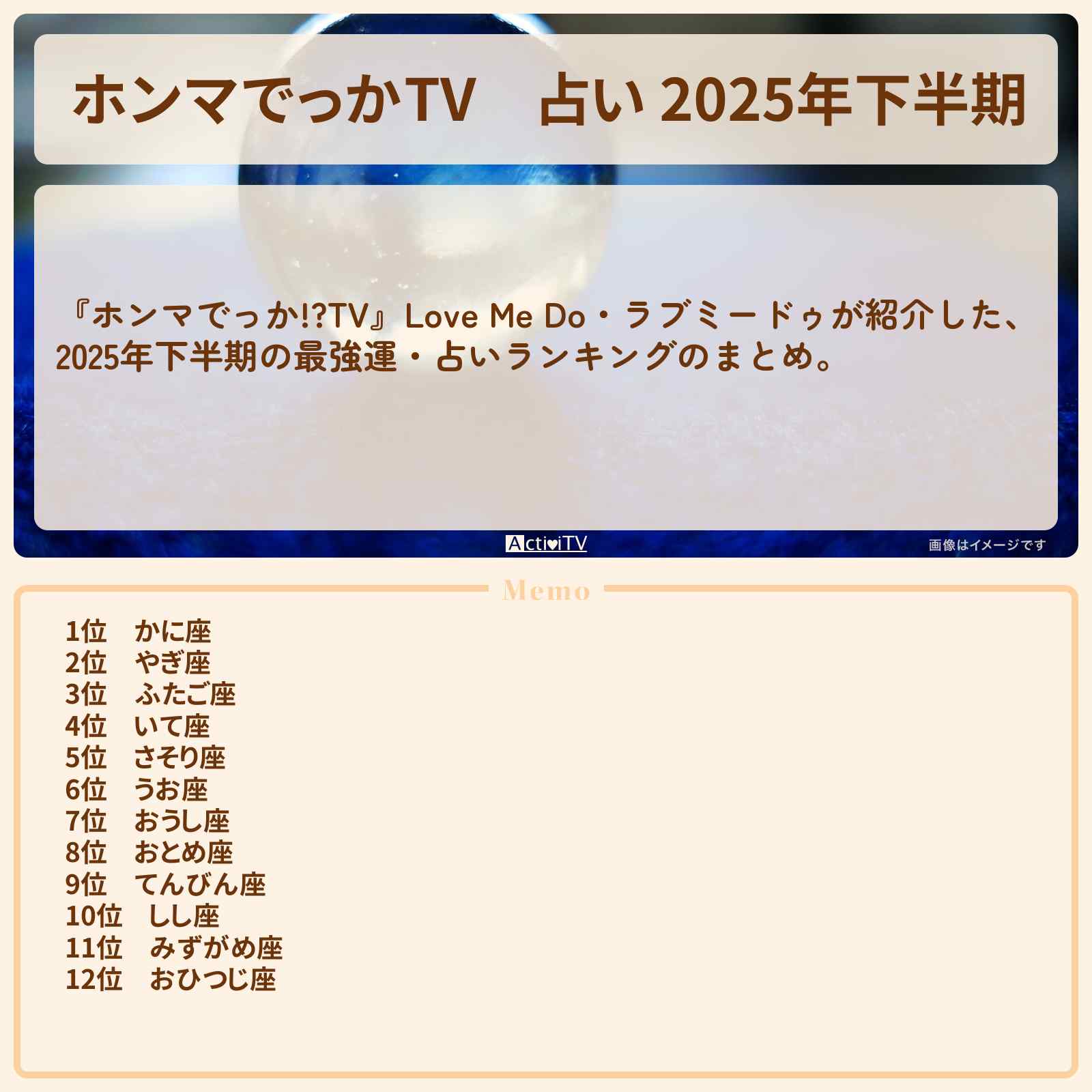 放送の【ホンマでっか!?TV】Love Me Do・ラブミードゥが紹介した、2025年下半期の最強運・占いランキングのまとめ。