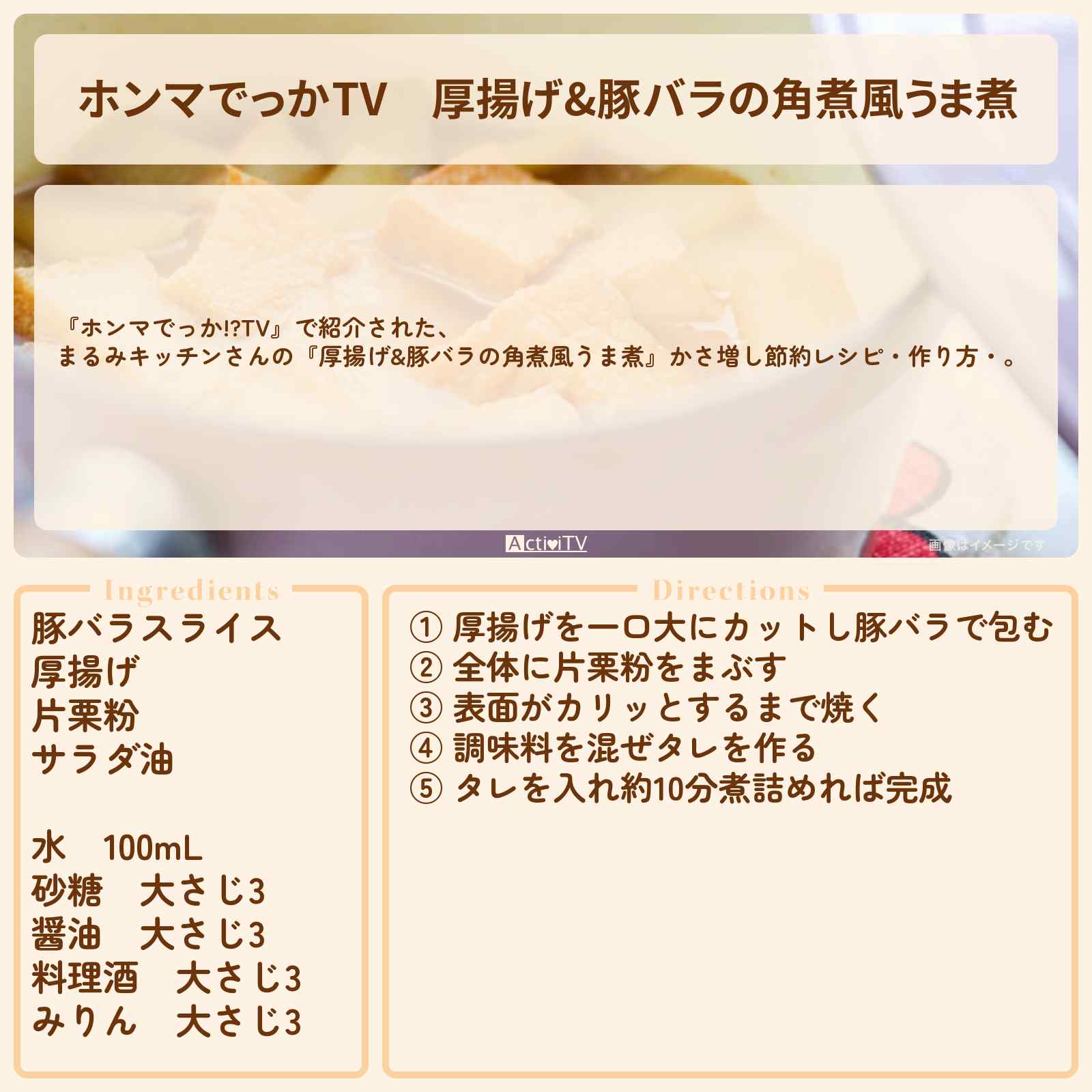(水)放送の【ホンマでっか!?TV】で紹介された、まるみキッチンさんの『厚揚げ&豚バラの角煮風うま煮』かさ増し節約レシピ・作り方・。