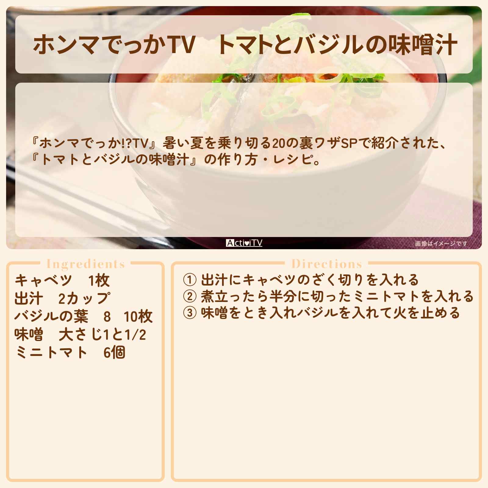 (水)放送の【ホンマでっか!?TV】暑い夏を乗り切る20の裏ワザSPで紹介された、『トマトとバジルの味噌汁』の作り方・レシピ。
