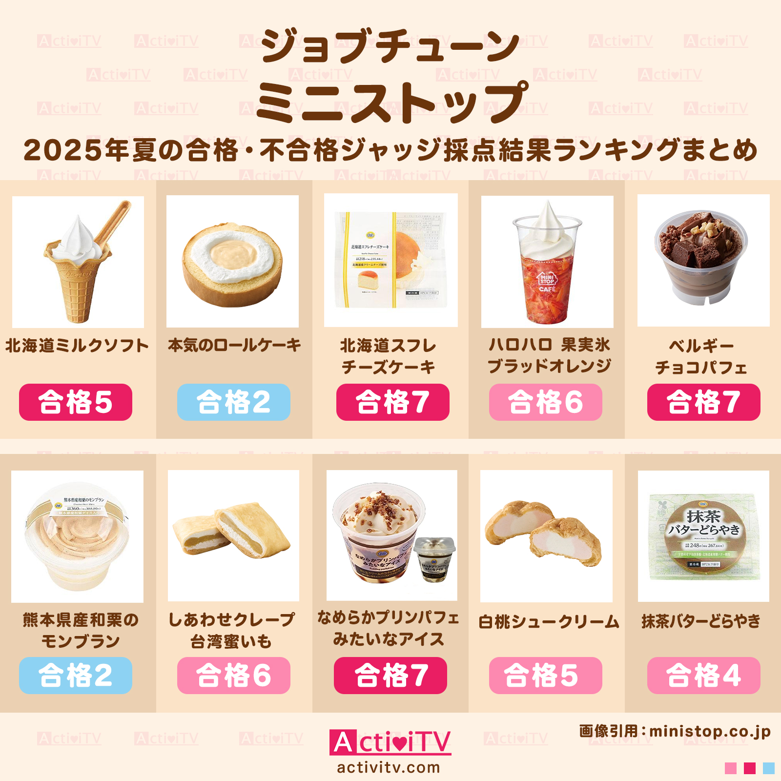 番組では昨年の7月の全品合格から1年ぶりの6度目の挑戦となるミニストップのコンビニスイーツジャッジ。リニューアルした「ソフトクリーム」・新フレーバー「ハロハロ」・「モンブラン」「ロールケーキ」などが挑戦しました。