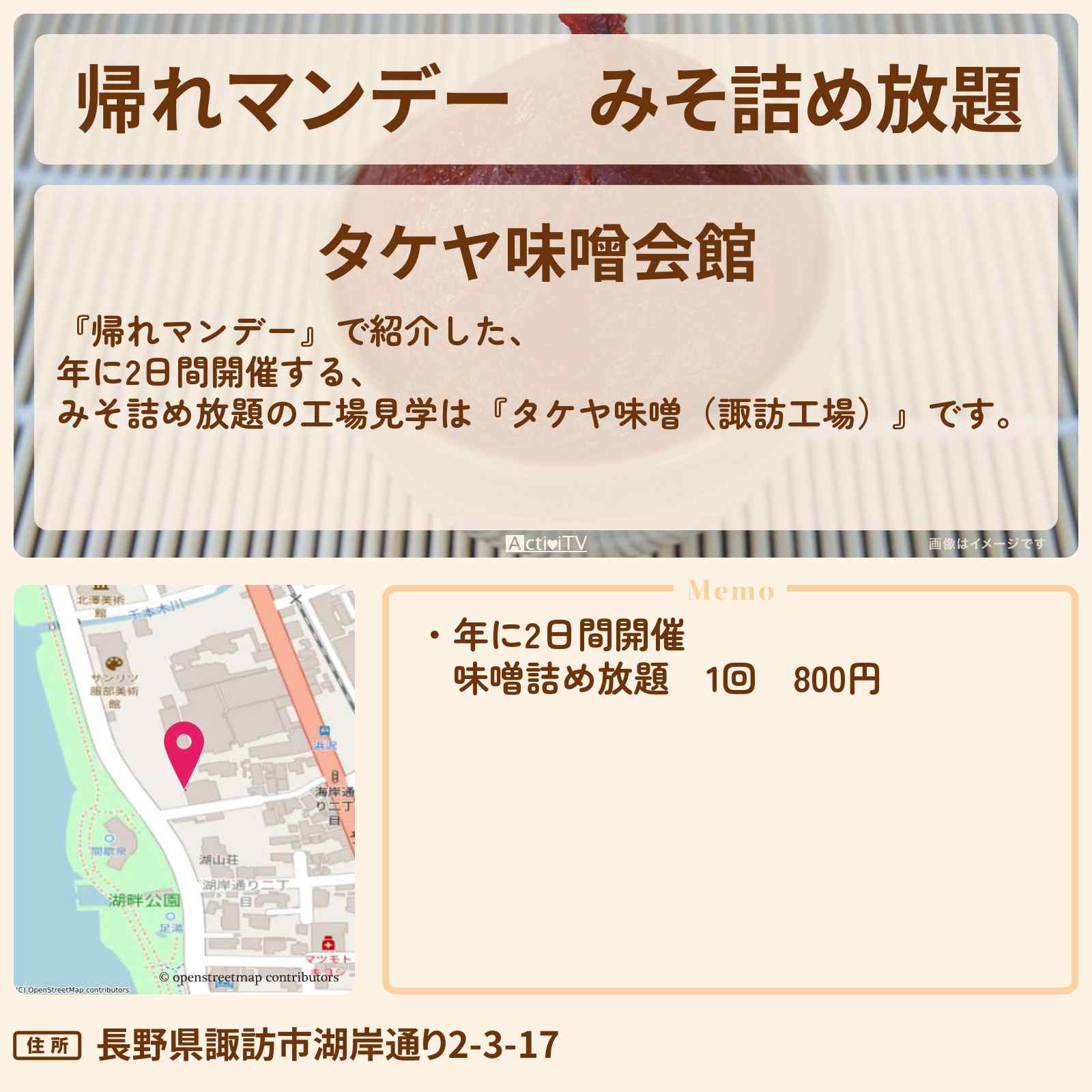 放送の【帰れマンデー】で紹介した、年に2日間開催する、みそ詰め放題の工場見学は『タケヤ味噌(諏訪工場)』です。