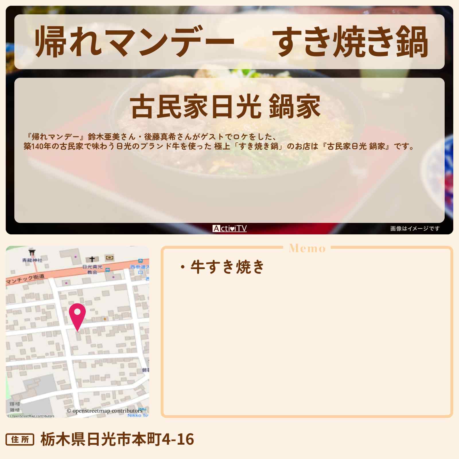 放送の【帰れマンデー】鈴木亜美さん・後藤真希さんがゲストでロケをした、築140年の古民家で味わう日光のブランド牛を使った 極上「すき焼き鍋」のお店は『古民家日光 鍋家』です。