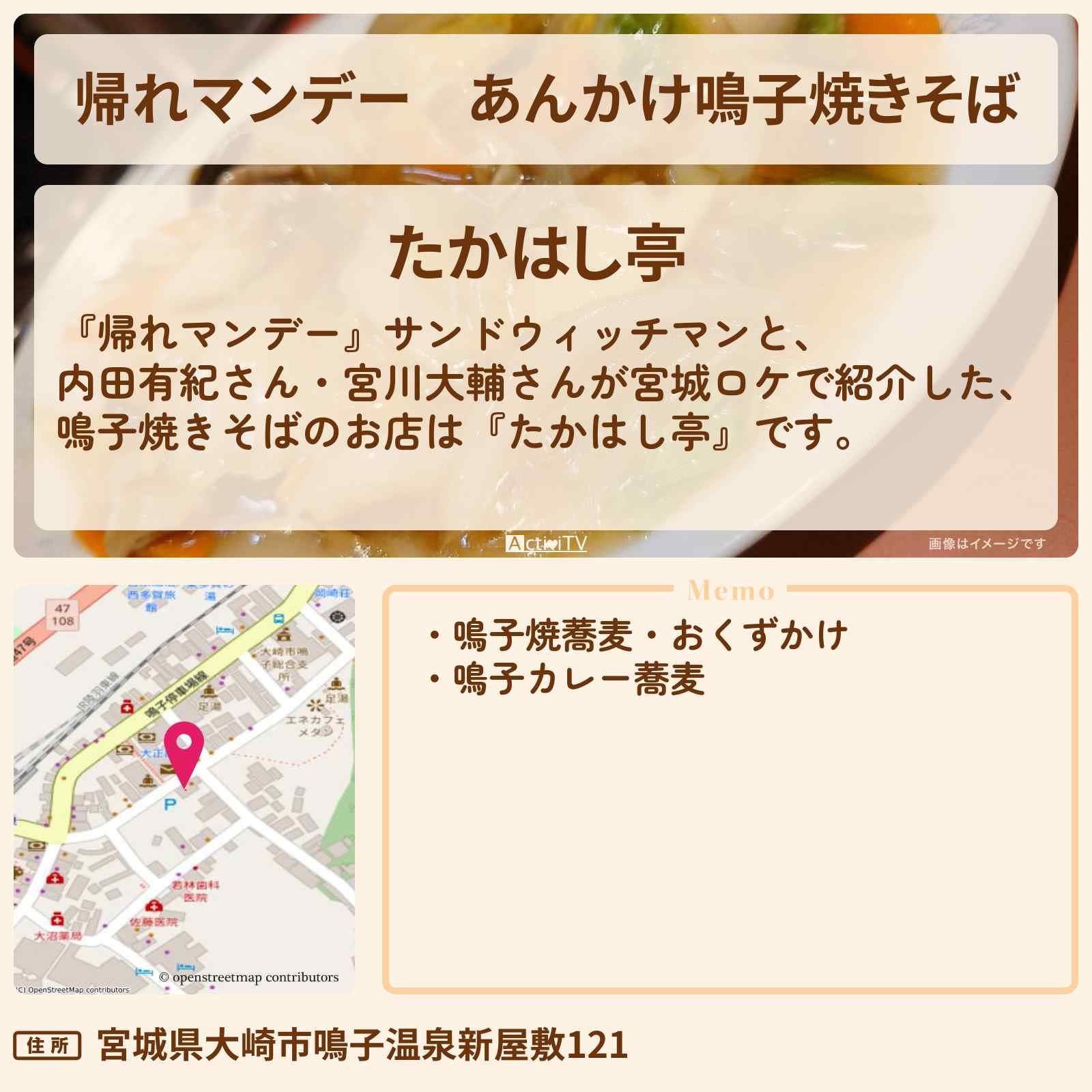 放送の【帰れマンデー】サンドウィッチマンと、内田有紀さん・宮川大輔さんが宮城ロケで紹介した、鳴子焼きそばのお店は『たかはし亭』です。