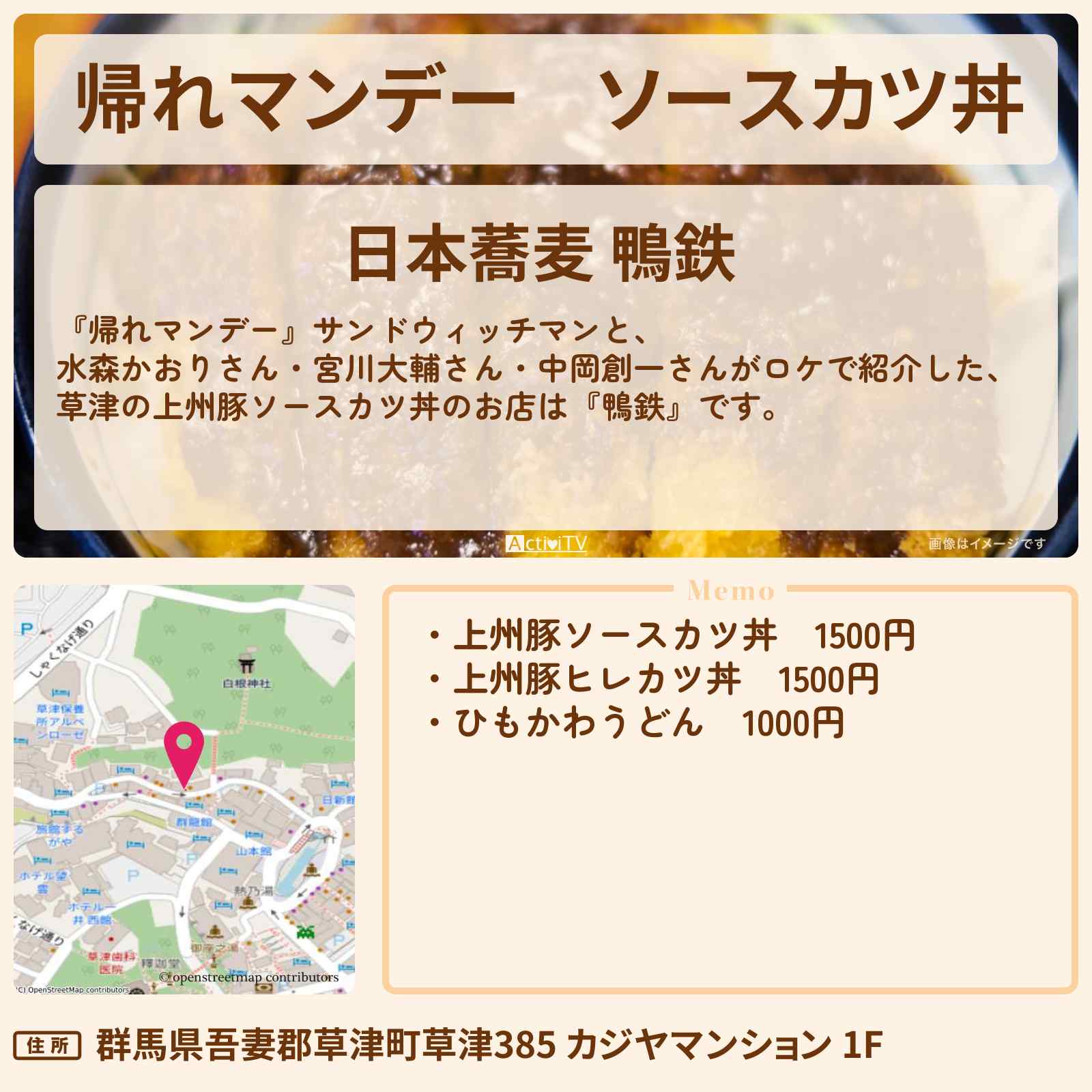 放送の【帰れマンデー】サンドウィッチマンと、水森かおりさん・宮川大輔さん・中岡創一さんがロケで紹介した、草津の上州豚ソースカツ丼のお店は『鴨鉄』です。