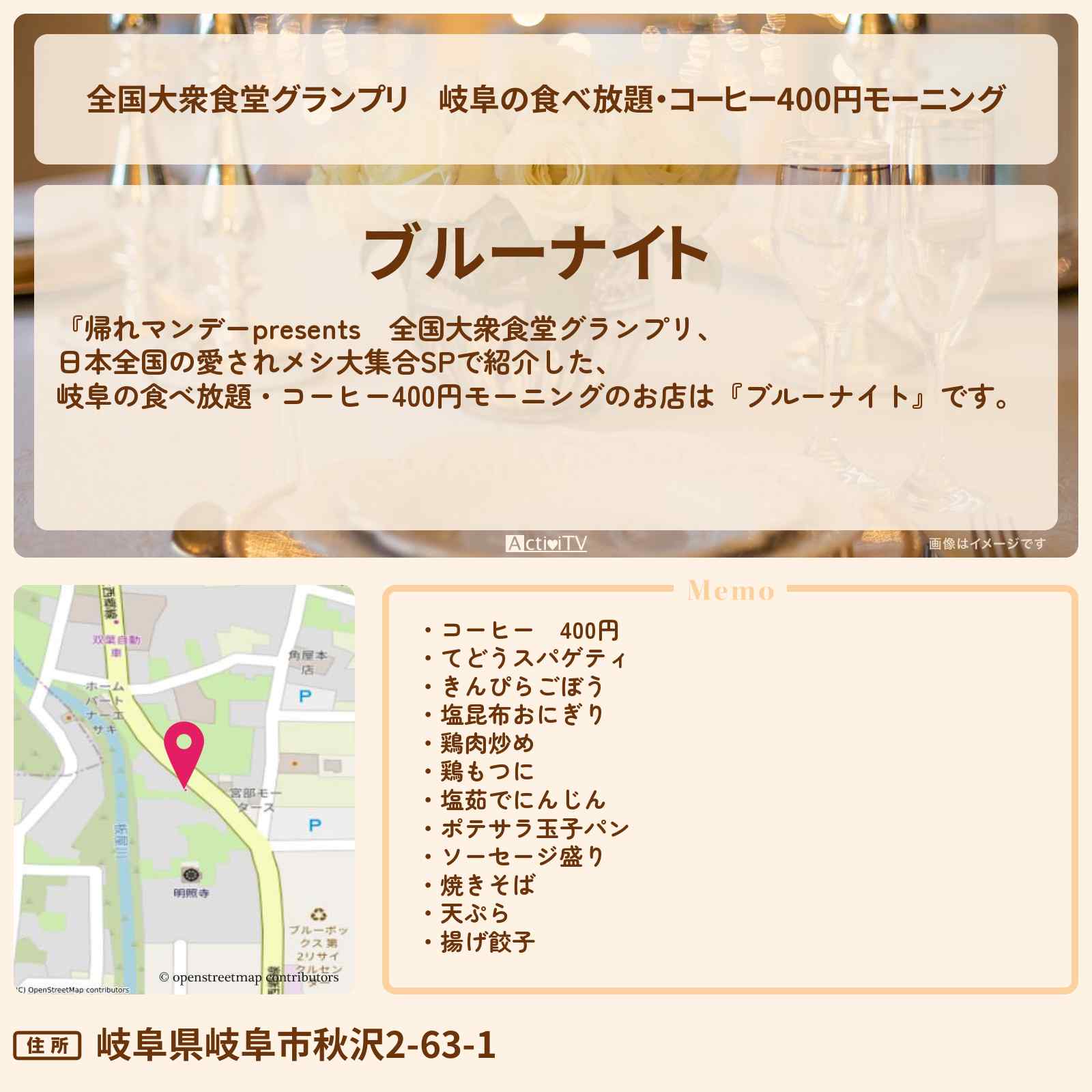 放送の【帰れマンデーpresents 全国大衆食堂グランプリ、日本全国の愛されメシ大集合SPで紹介した、岐阜の食べ放題・コーヒー400円モーニングのお店は『ブルーナイト』です。