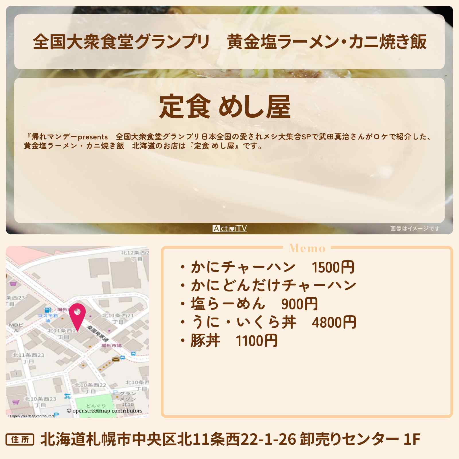 放送の【帰れマンデーpresents 全国大衆食堂グランプリ日本全国の愛されメシ大集合SPで武田真治さんがロケで紹介した、黄金塩ラーメン・カニ焼き飯 北海道のお店は『定食 めし屋』です。