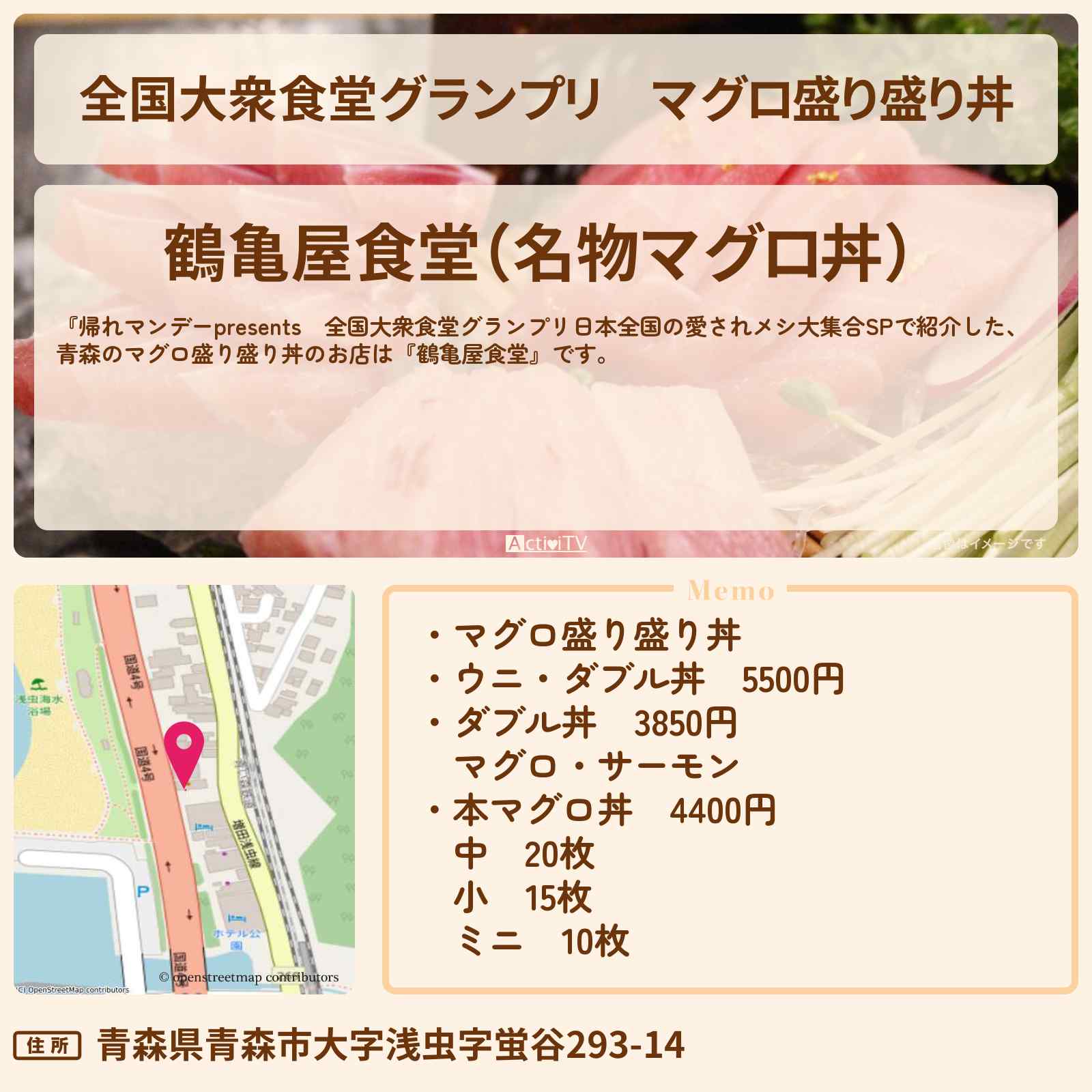 放送の【帰れマンデーpresents 全国大衆食堂グランプリ日本全国の愛されメシ大集合SPで紹介した、青森のマグロ盛り盛り丼のお店は『鶴亀屋食堂』です。
