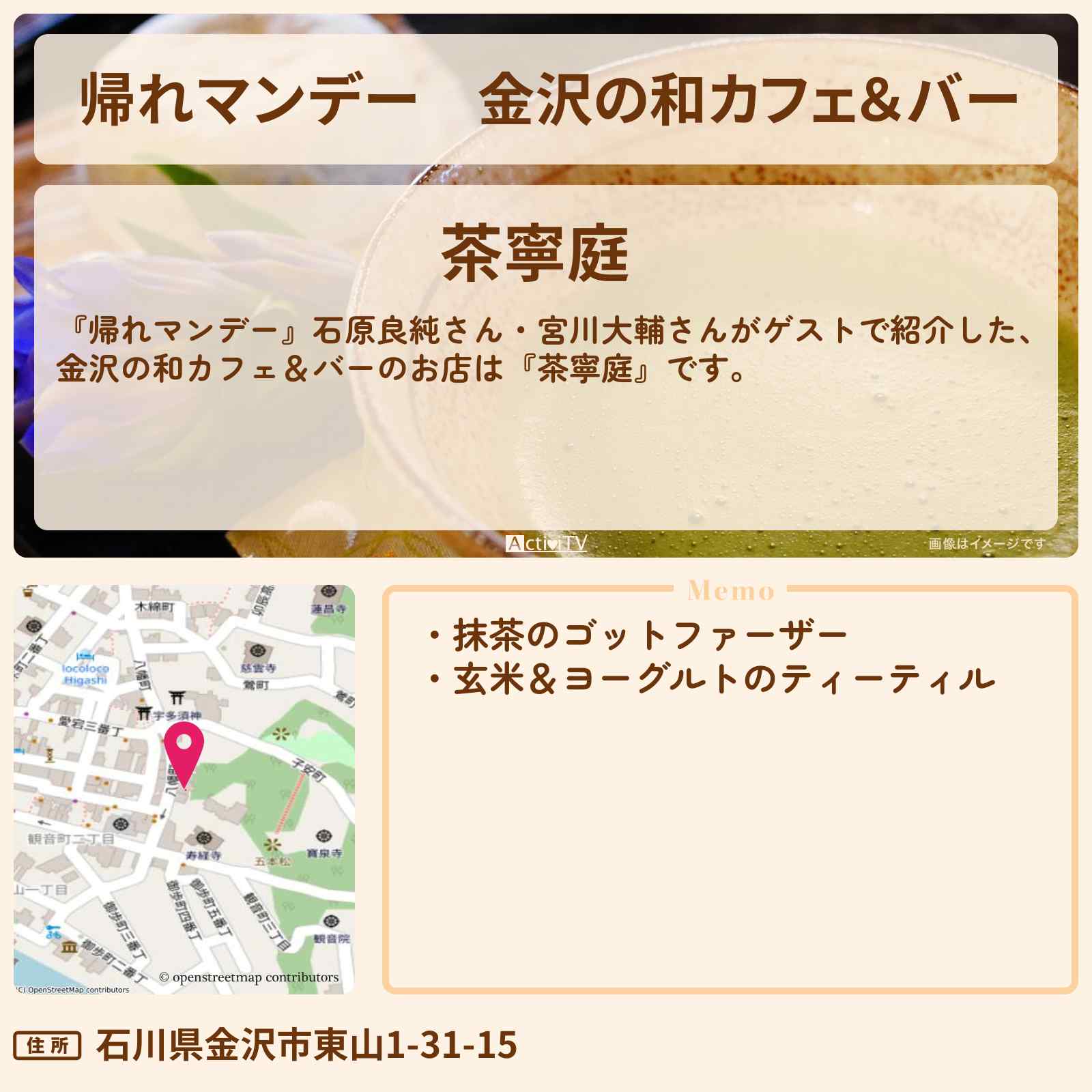 このお店の特徴は、地元石川県の素材を活かしたミクソロジーカクテルを楽しめることです。ミクソロジーとは、新鮮なフルーツやハーブ、スパイスなどを組み合わせて新しい味わいを生み出すカクテルのスタイルで、ロンドンで発祥しました。茶寧庭では、日本随一のミクソロジスト・南雲主于三氏が監修したメニューを、店主の濱真太さんが丁寧に仕上げています。