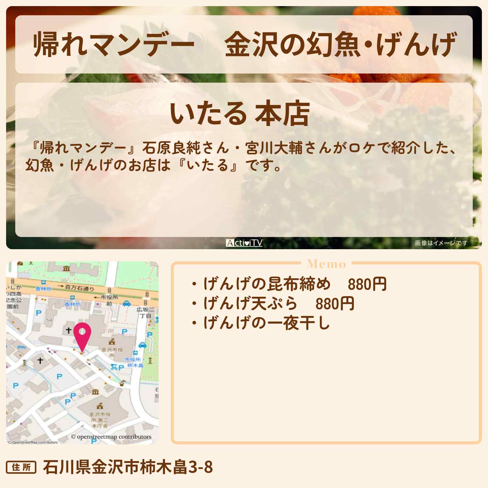 放送の【帰れマンデー】石原良純さん・宮川大輔さんがロケで紹介した、幻魚・げんげのお店は『いたる』です。