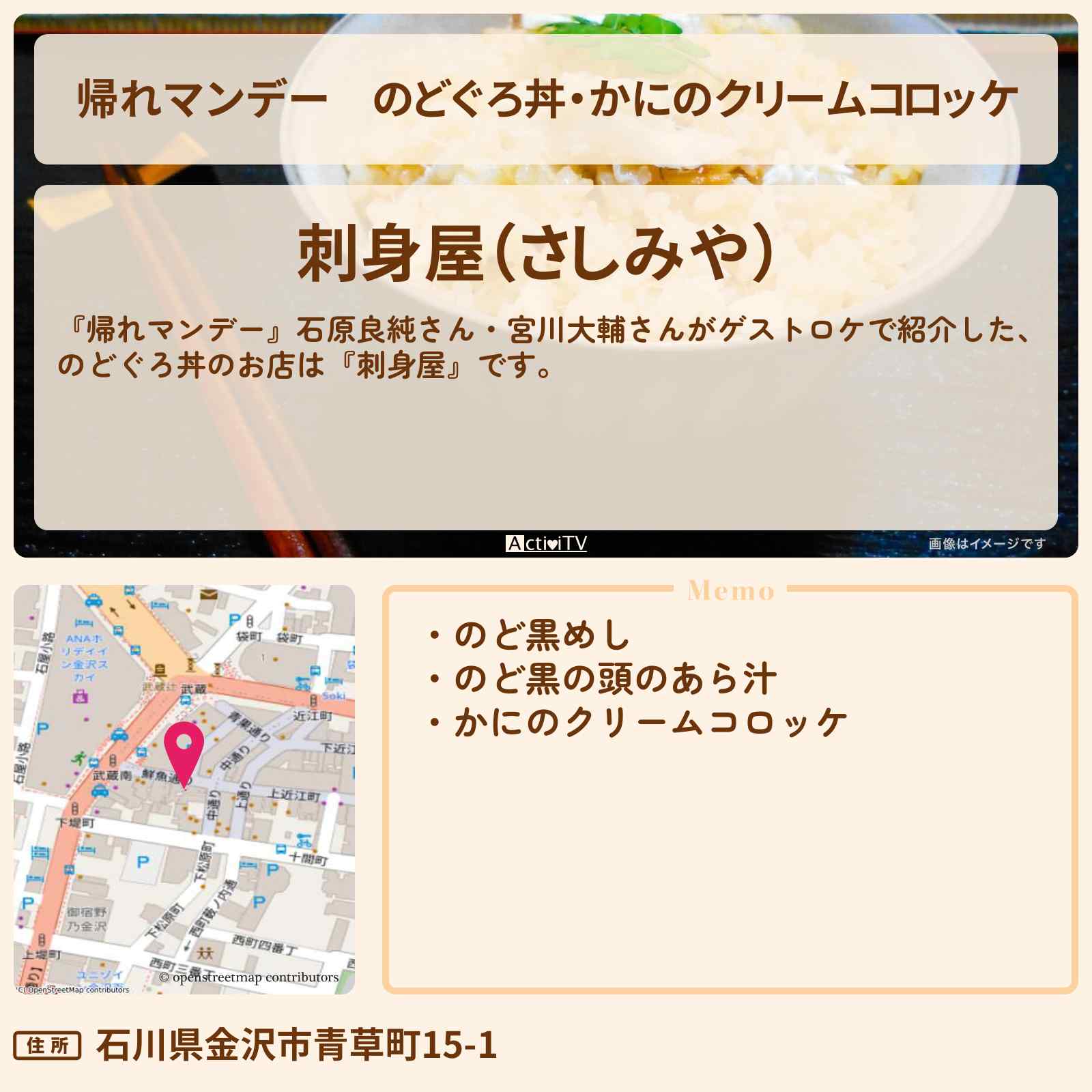 【帰れマンデー】のどぐろ丼・かにのクリームコロッケ『刺身屋』金沢のお店の場所〔石原良純・宮川大輔〕