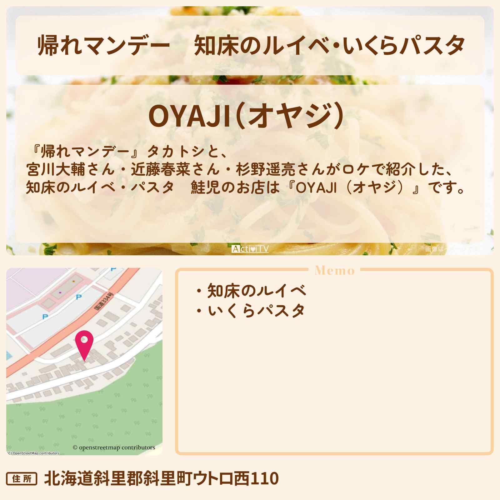 放送の【帰れマンデー】タカトシと、宮川大輔さん・近藤春菜さん・杉野遥亮さんがロケで紹介した、知床のルイベ・パスタ 鮭児のお店は『OYAJI(オヤジ)』です。