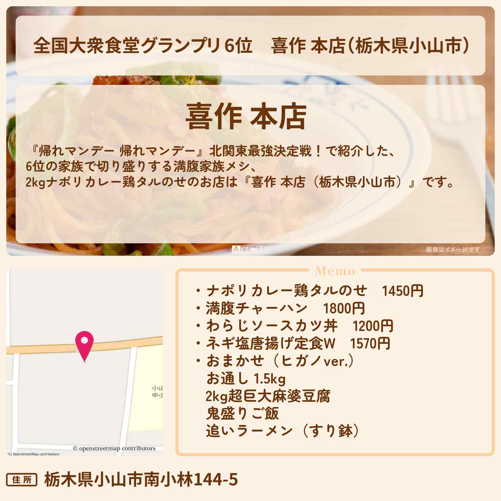 6位 満腹家族メシ 新大平下駅「喜作 本店」