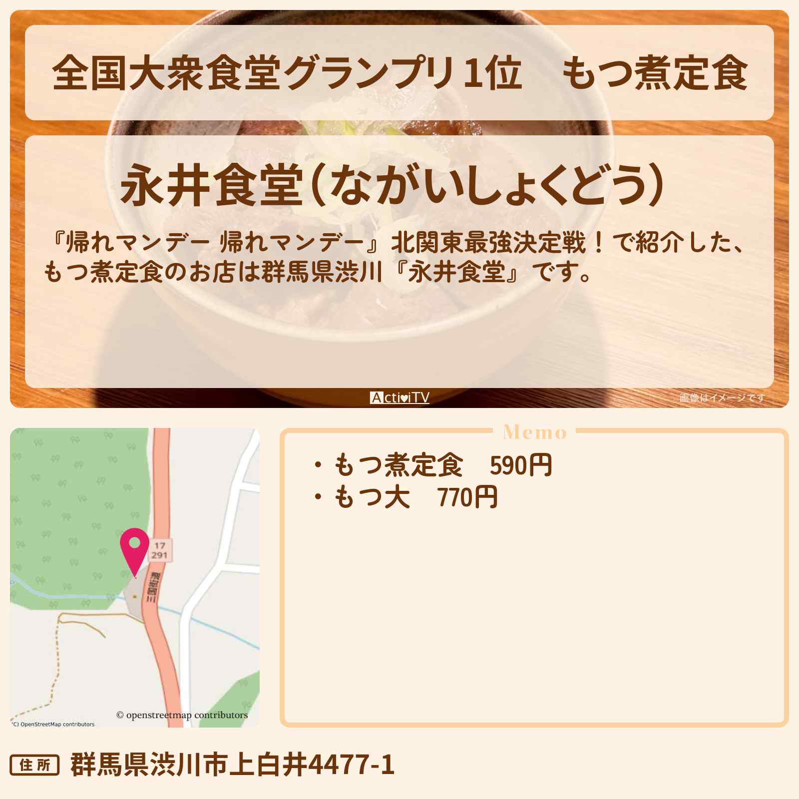 放送の【帰れマンデー 帰れマンデー】北関東最強決定戦!で紹介した、もつ煮定食のお店は群馬県渋川『永井食堂』です。