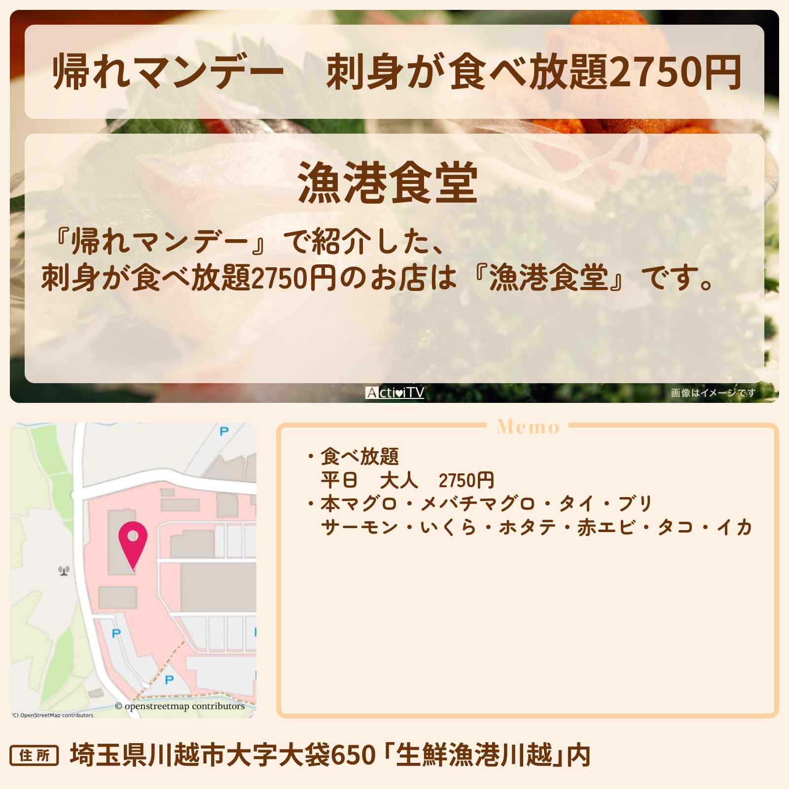 こちらは『漁港食堂(川越/バイキング)』のお店ページです。Rettyで食が好きなグルメな人たちからお店を探そう!