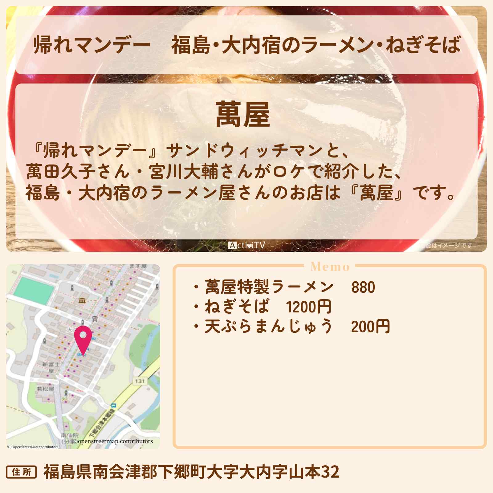 放送の【帰れマンデー】サンドウィッチマンと、萬田久子さん・宮川大輔さんがロケで紹介した、福島・大内宿のラーメン屋さんのお店は『萬屋』です。