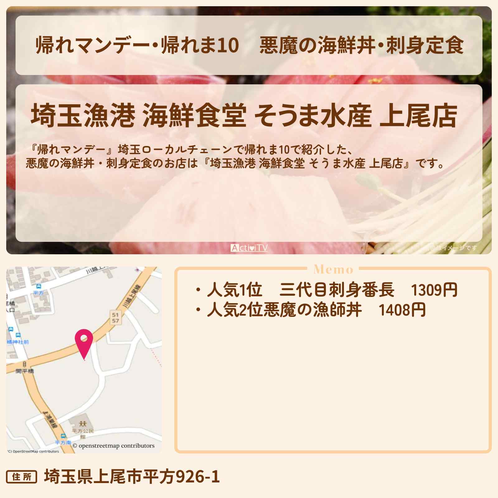 指扇駅「埼玉漁港 海鮮食堂 そうま水産 上尾店」