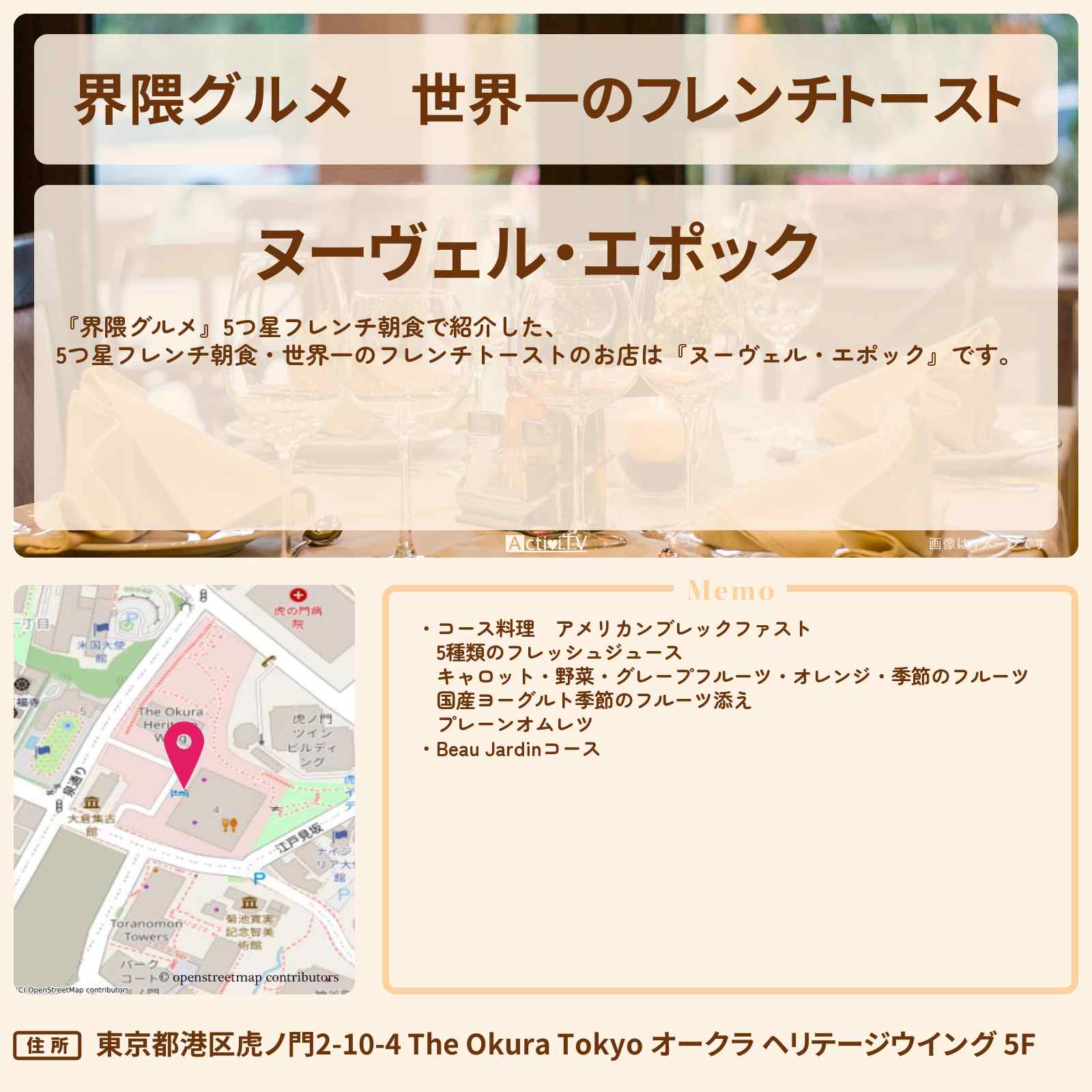 【界隈グルメ】世界一のフレンチトースト『ヌーヴェル・エポック』オークラ東京のお店・ロケ地を紹介
