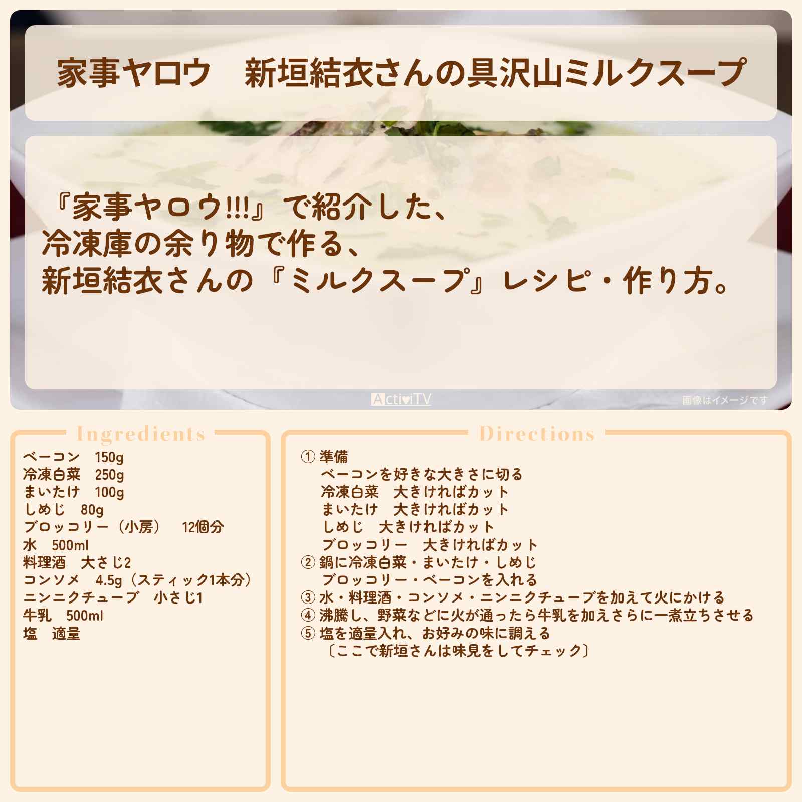 放送の【家事ヤロウ!!!】で紹介した、冷凍庫の余り物で作る、新垣結衣さんの『ミルクスープ』レシピ・作り方。