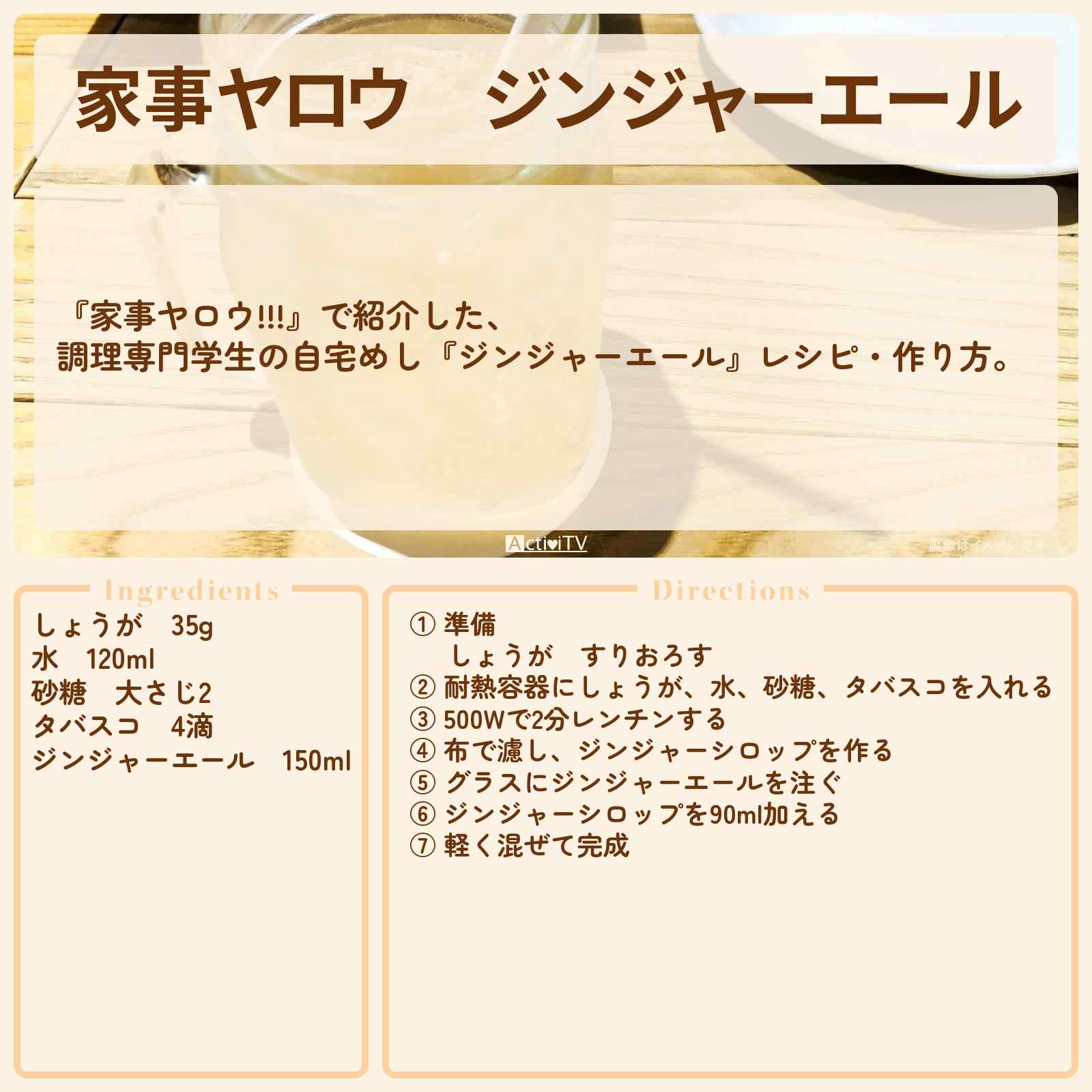 放送の【家事ヤロウ!!!】で紹介した、調理専門学生の自宅めし『ジンジャーエール』レシピ・作り方。