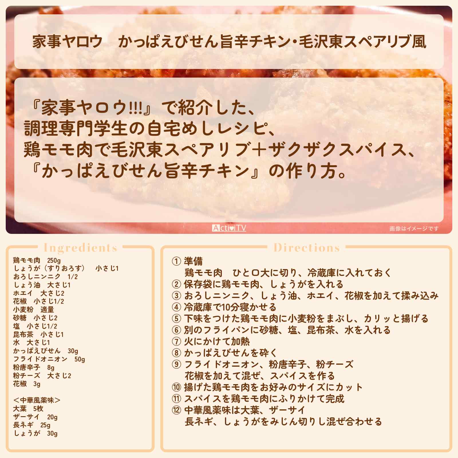 放送の【家事ヤロウ!!!】で紹介した、調理専門学生の自宅めしレシピ、鶏モモ肉で毛沢東スペアリブ+ザクザクスパイス、『かっぱえびせん旨辛チキン』の作り方。