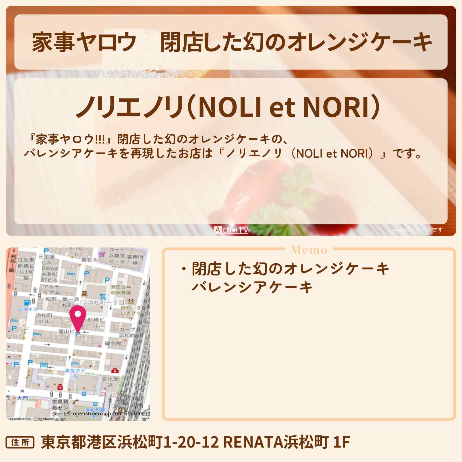 放送の【家事ヤロウ!!!】閉店した幻のオレンジケーキの、バレンシアケーキを再現したお店は『ノリエノリ(NOLI et NORI)』です。