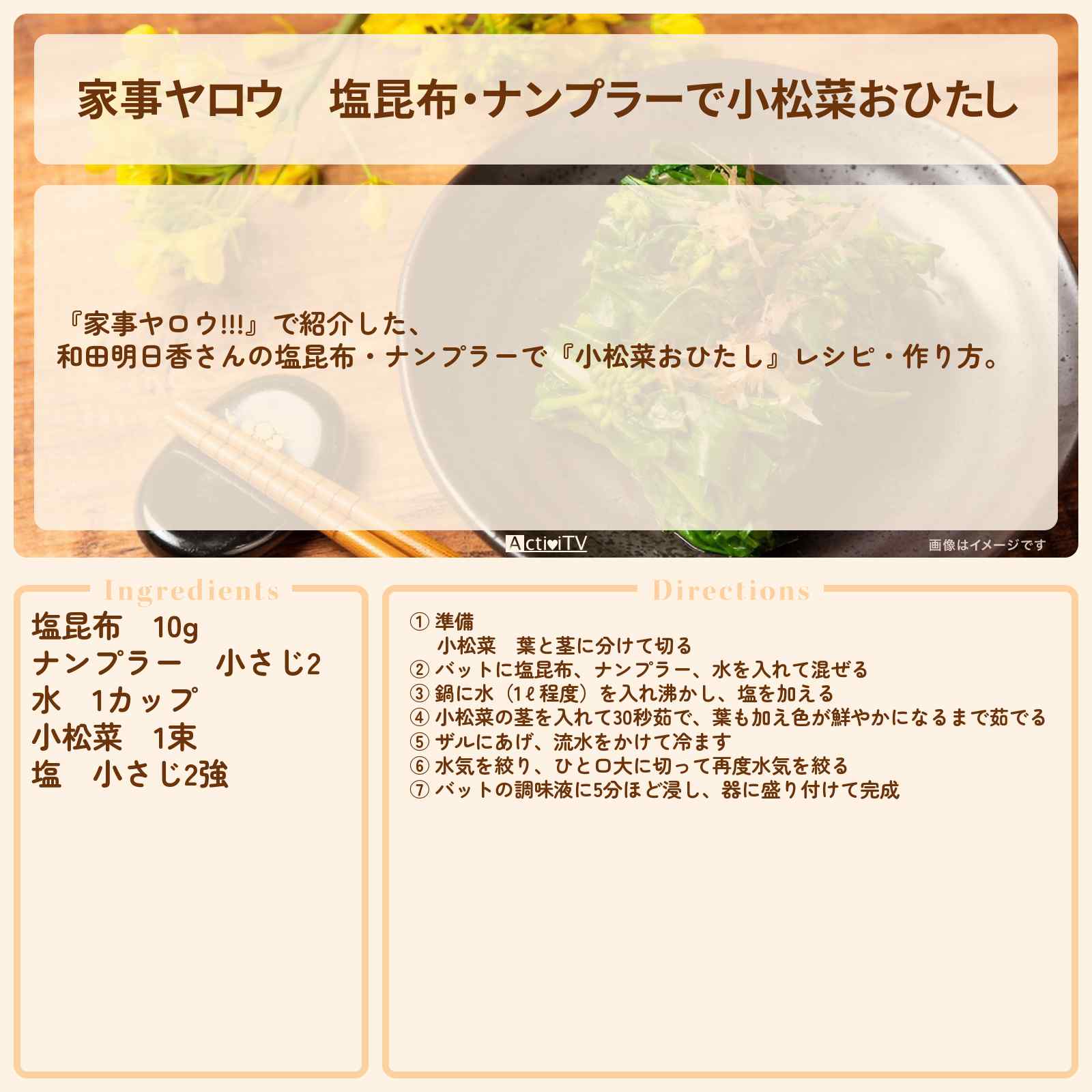 放送の【家事ヤロウ!!!】で紹介した、和田明日香さんの塩昆布・ナンプラーで『小松菜おひたし』レシピ・作り方。