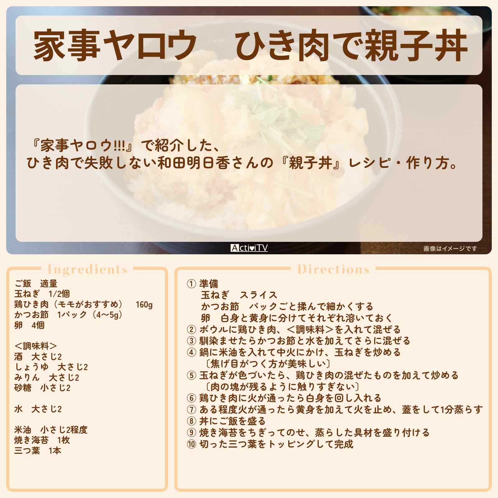 放送の【家事ヤロウ!!!】で紹介した、ひき肉で失敗しない和田明日香さんの『親子丼』レシピ・作り方。