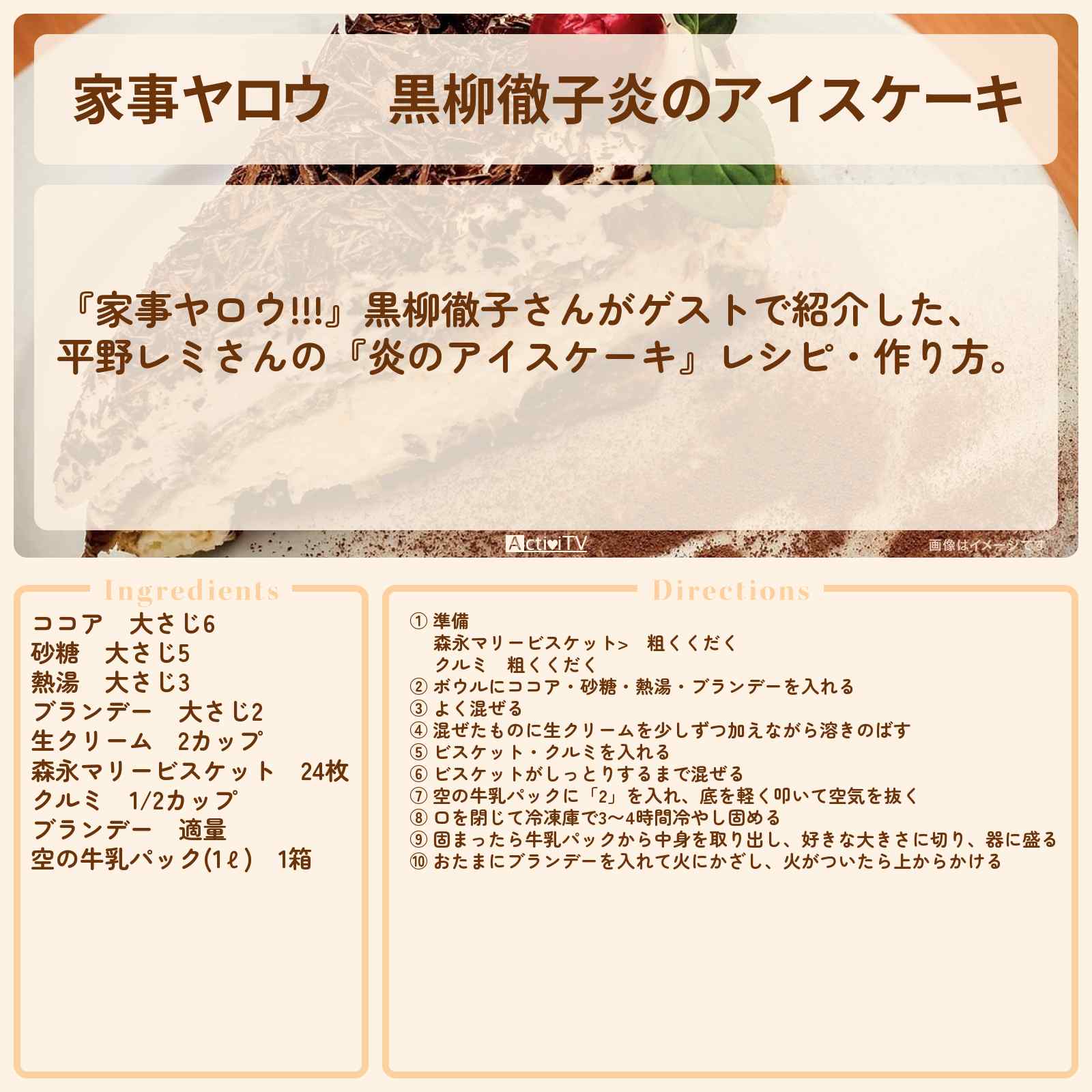 放送の【家事ヤロウ!!!】黒柳徹子さんがゲストで紹介した、平野レミさんの『炎のアイスケーキ』レシピ・作り方。