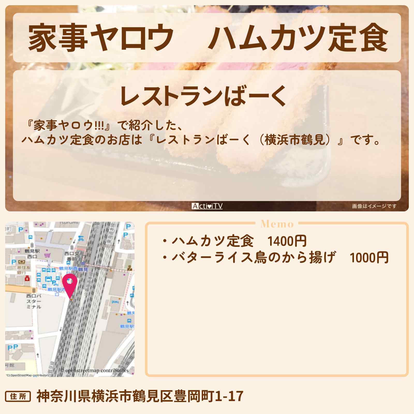 【家事ヤロウ】ハムカツ定食『レストランばーく(横浜市鶴見)』のお店情報