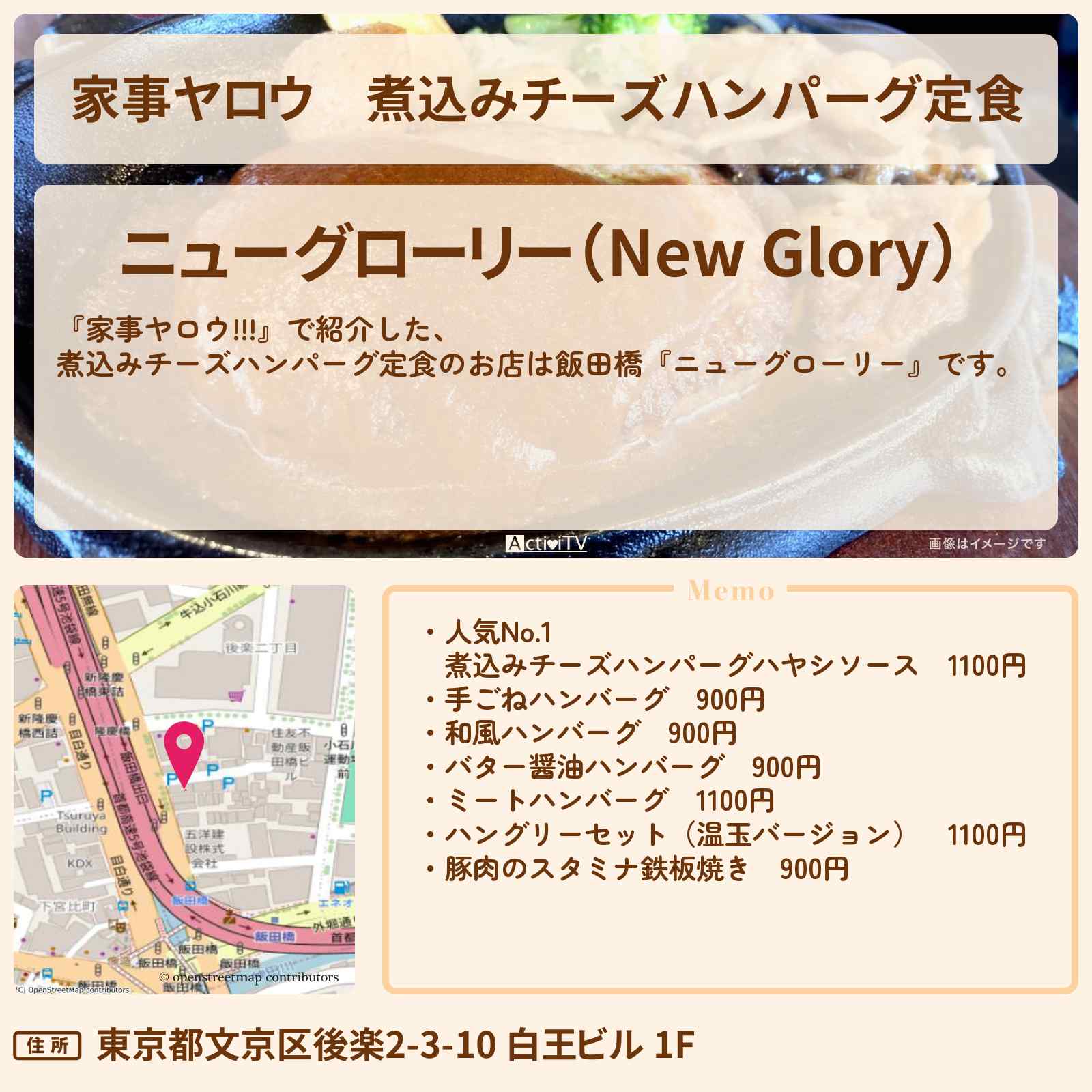 ニューグローリー(飯田橋/居酒屋/創作)の店舗情報・予約なら、お得なクーポン満載【ホットペッパーグルメ】!ニューグローリーのおすすめポイントは、柔らかい食感のハンバーグにアツアツのチーズがとろりと絡んでとても美味しいのでオススメです。 大人数でもご利用いただける広々とした店内。様々なシーンでお楽しみいただけます。。ニューグローリーの地図、メニュー、口コミ、写真などグルメ情報満載です!…