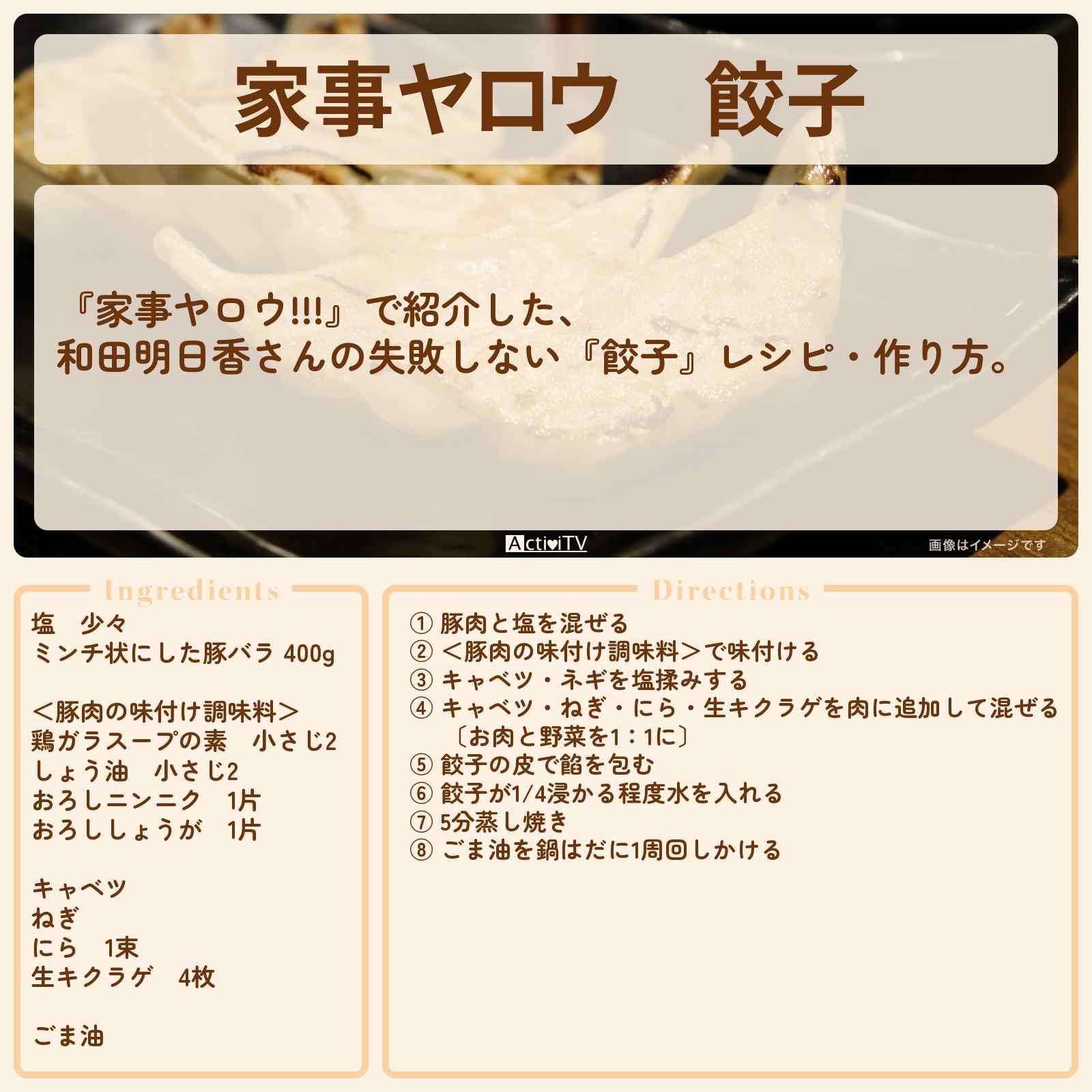 放送の【家事ヤロウ!!!】で紹介した、和田明日香さんの失敗しない『餃子』レシピ・作り方。