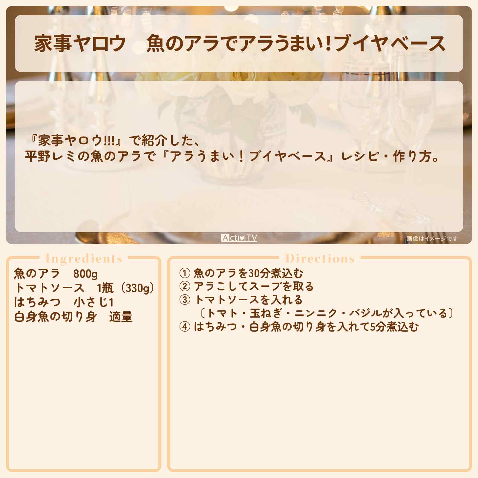 放送の【家事ヤロウ!!!】で紹介した、平野レミの魚のアラで『アラうまい!ブイヤベース』レシピ・作り方。