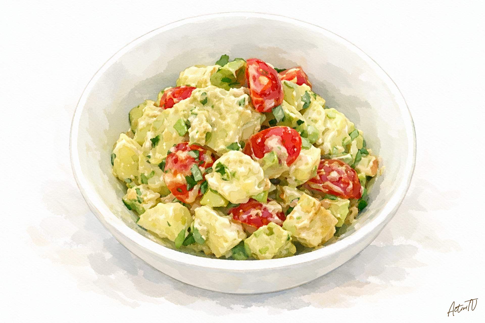 バジルの爽やかな香りとアボカドの濃厚さが重なる、洋風ポテトサラダ。レンジ加熱でじゃがいもを手軽に仕上げ、忙しい日でも作りやすいのが魅力です。