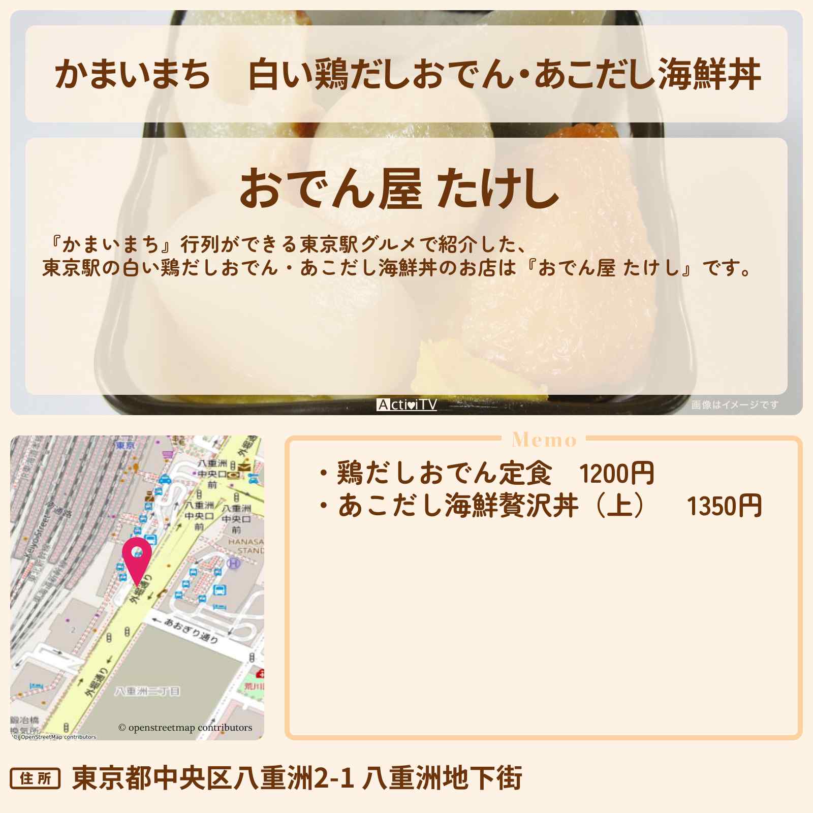 放送の【かまいまち】行列ができる東京駅グルメで紹介した、東京駅の白い鶏だしおでん・あこだし海鮮丼のお店は『おでん屋 たけし』です。