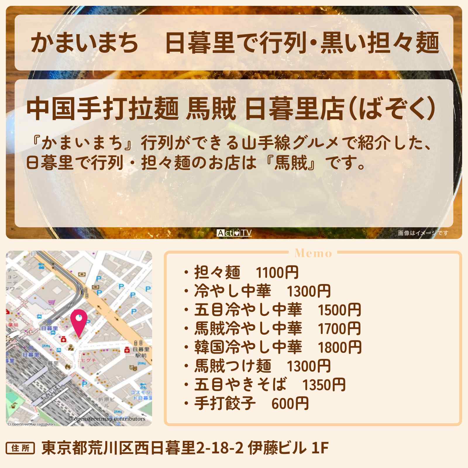 [ラーメン好き人気店☆☆] こちらは『中国手打拉麺 馬賊 日暮里店(日暮里/ラーメン)』のお店ページです。実名でのオススメが590件集まっています。Rettyで食が好きなグルメな人たちからお店を探そう……