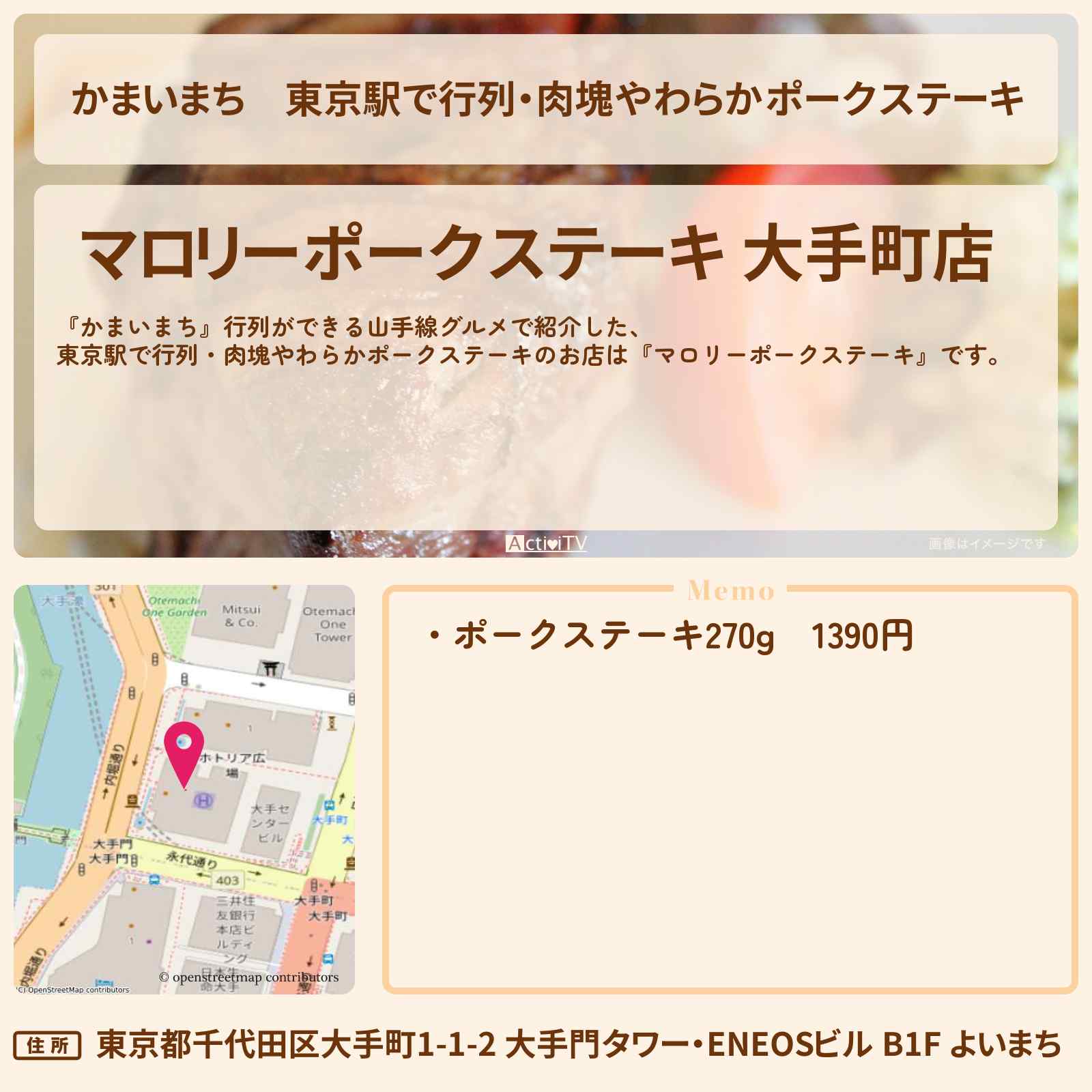 | 住所 | 東京都千代田区大手町1-1-2 大手門タワー・ENEOSビル B1F よいまち |