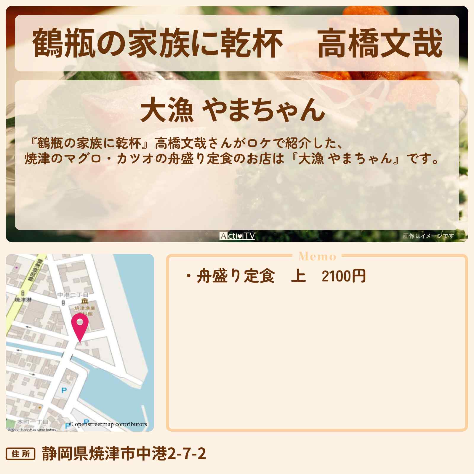 放送の【鶴瓶の家族に乾杯】高橋文哉さんがロケで紹介した、焼津のマグロ・カツオの舟盛り定食のお店は『大漁 やまちゃん』です。