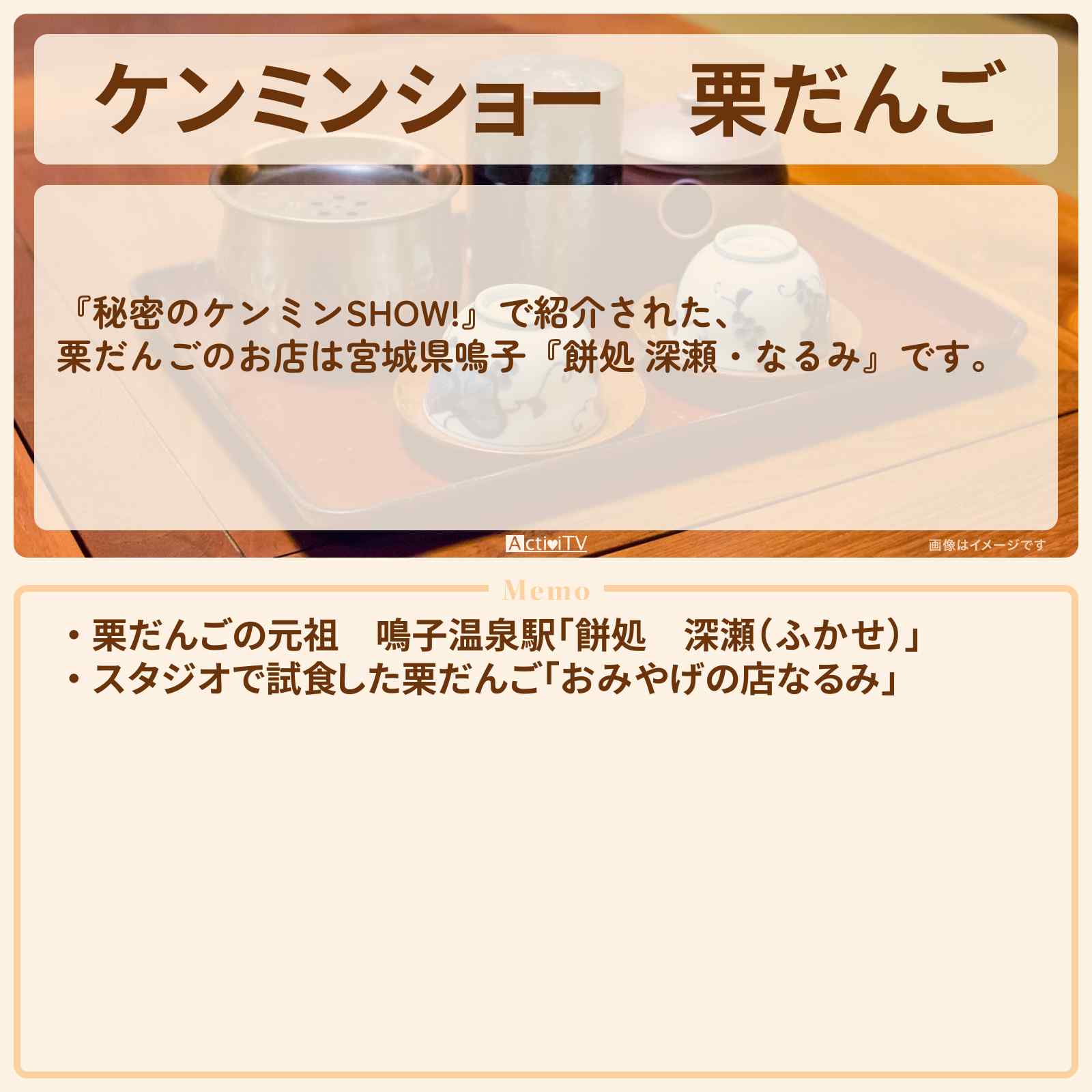 (木)放送の【秘密のケンミンSHOW!】で紹介された、栗だんごのお店は宮城県鳴子『餅処 深瀬・なるみ』です。