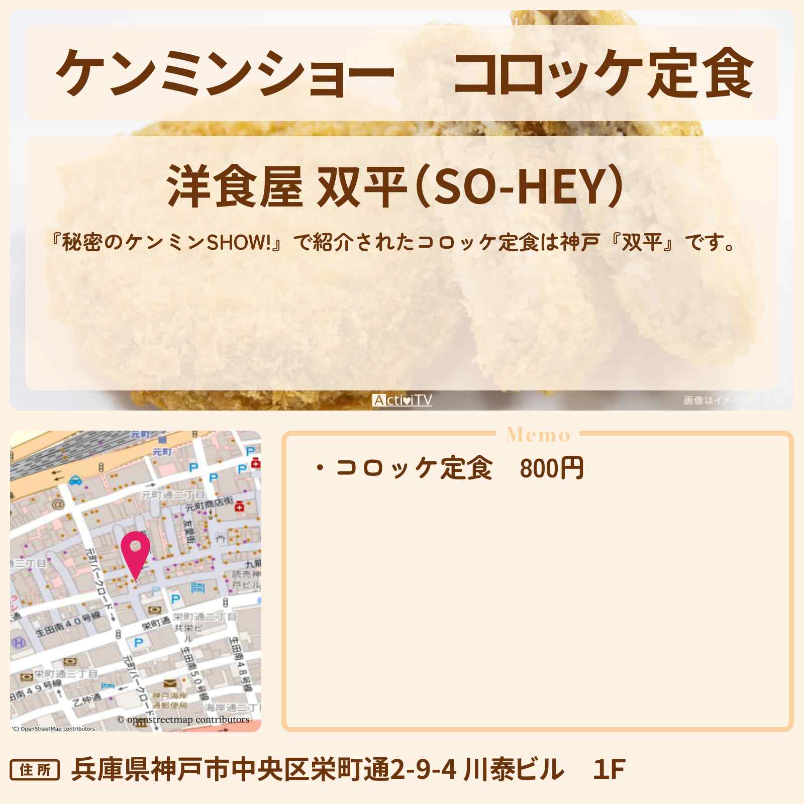 (木)放送の【秘密のケンミンSHOW!】で紹介されたコロッケ定食は神戸『双平』です。