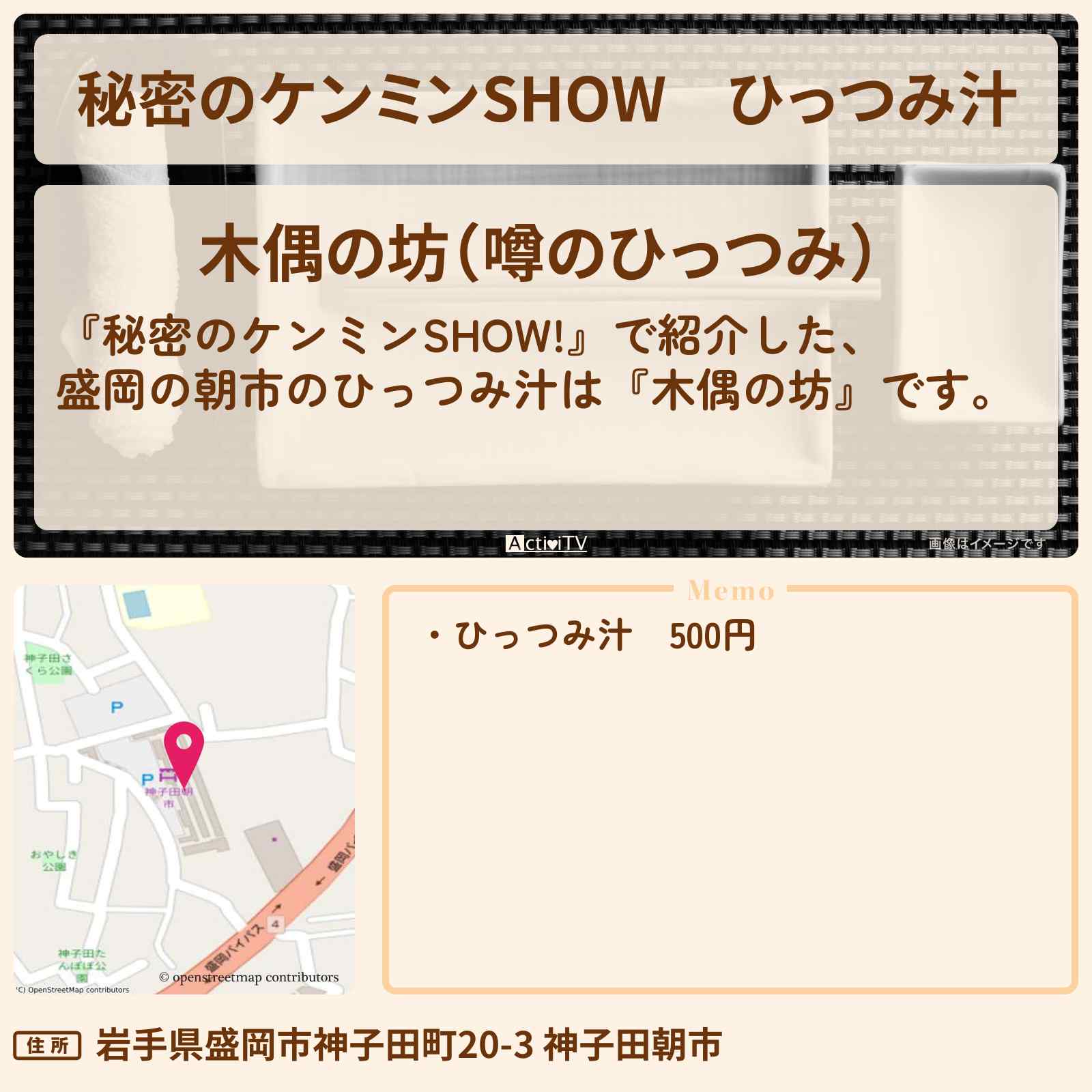 (木)放送の【秘密のケンミンSHOW!】で紹介した、盛岡の朝市のひっつみ汁は『木偶の坊』です。