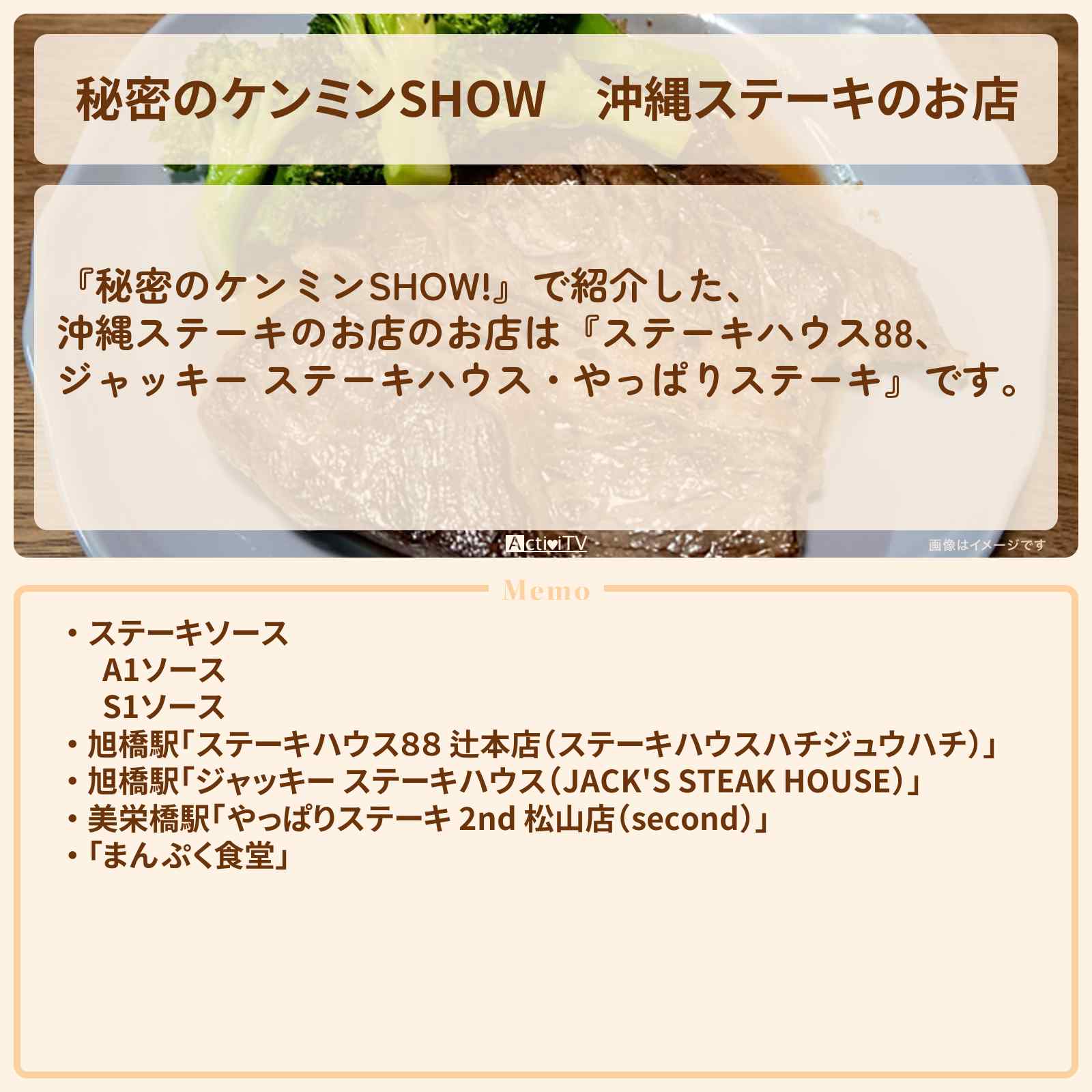(木)放送の【秘密のケンミンSHOW!】で紹介した、沖縄ステーキのお店のお店は『ステーキハウス88、ジャッキー ステーキハウス・やっぱりステーキ』です。