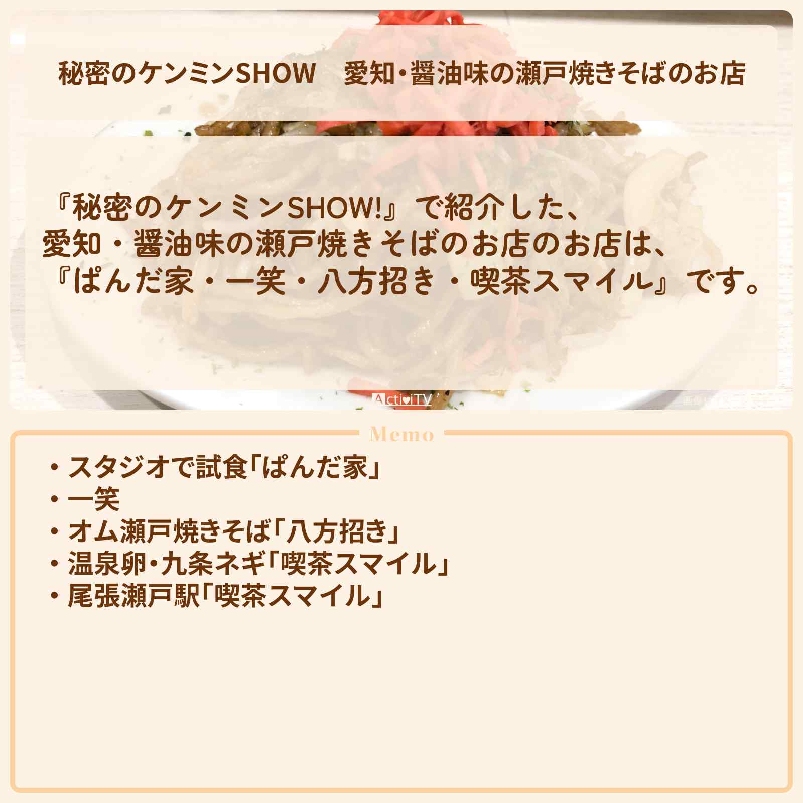 こちらのお店の名物は、具材を豚肉とキャベツのみに絞り、深蒸しの麺に甘辛い醤油ベースのタレを合わせた瀬戸焼そばです。瀬戸焼そばの特徴は、しっかり蒸すことでかん水が焦げて茶色くなった麺で、水分をよく吸収し独特の食感があることです。麺はもちっとした蒸し麺で、一本一本はすすって食べられないくらい短く、キャベツは細かく切られているためしんなりと甘く、豚肉も甘辛く煮込まれ味がしっかりしています。豚肉を醤油で甘辛く煮込んだタレが味の決め手となっており、鉄板の上で山のように麺とキャベツを焼き、最後にだし汁を上からかけると水蒸気でいい香りがあたりに流れます。