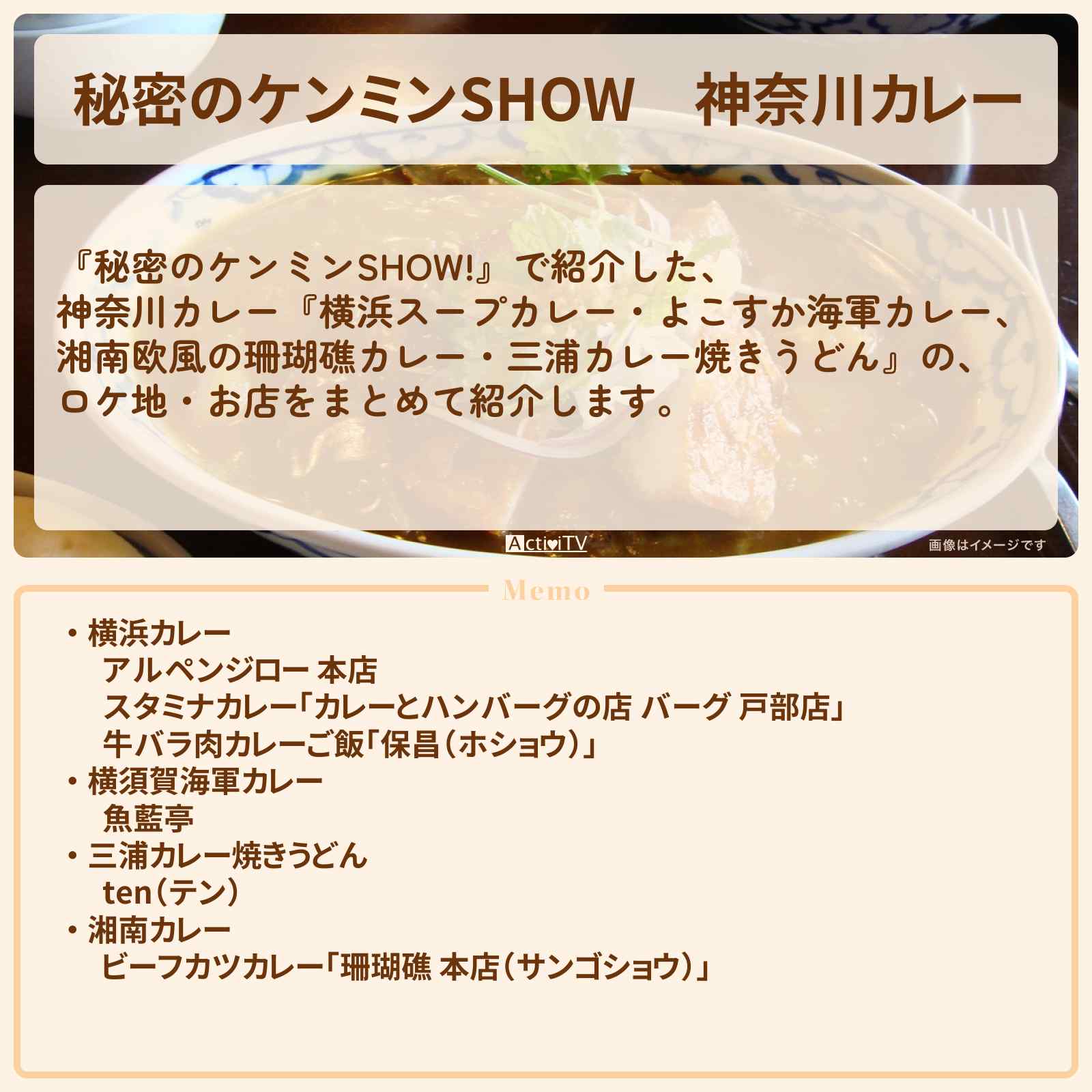 (木)放送の【秘密のケンミンSHOW!】で紹介した、神奈川カレー『横浜スープカレー・よこすか海軍カレー、湘南欧風の珊瑚礁カレー・三浦カレー焼きうどん』の、ロケ地・お店をまとめて紹介します。