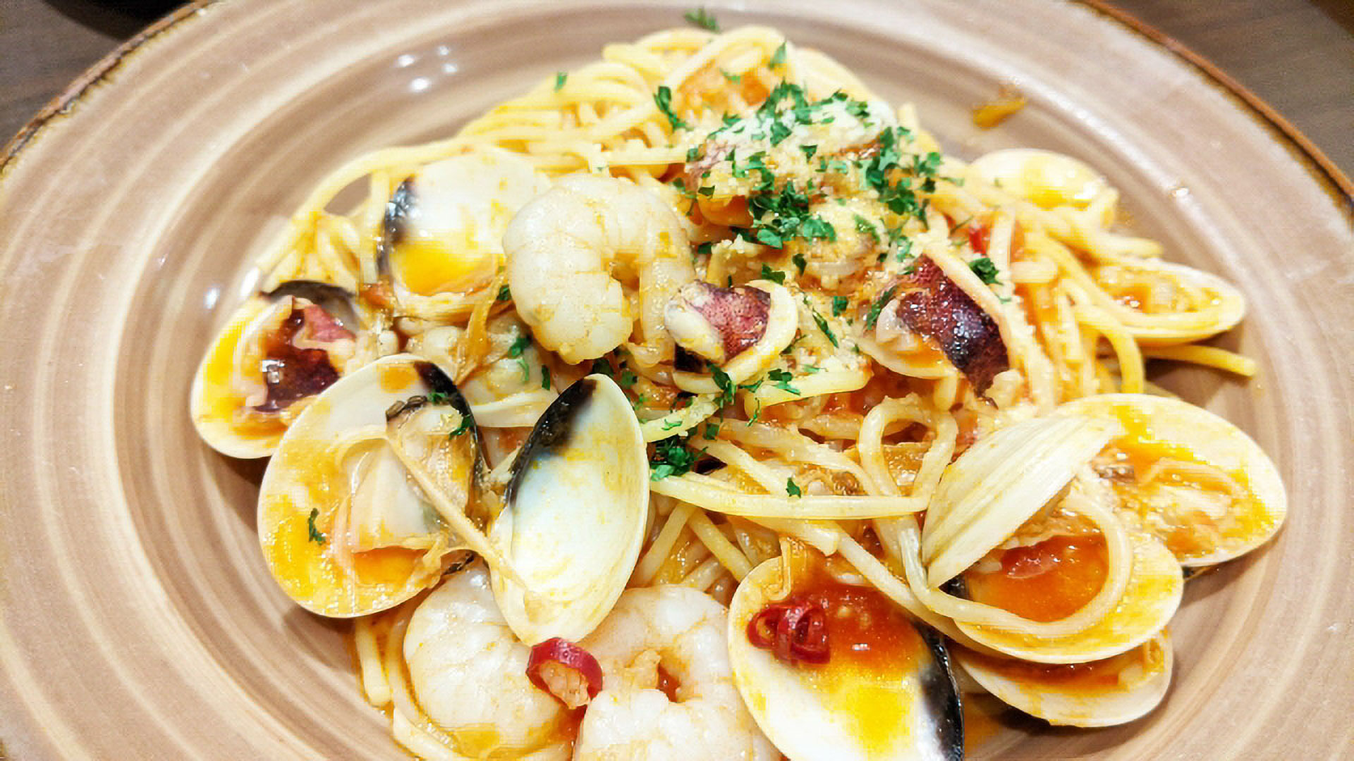 「ボンゴレビアンコ」はアサリと白ワインのバスタで、ブロンズタイプのザラザラしたタイプのパスタを使います。