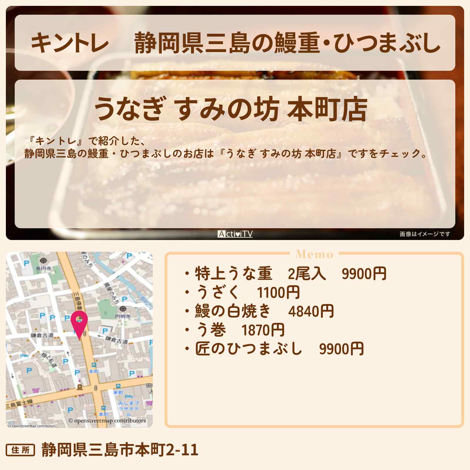 放送の【キントレ】で紹介した、静岡県三島の鰻重・ひつまぶしのお店は『うなぎ すみの坊 本町店』ですをチェック。