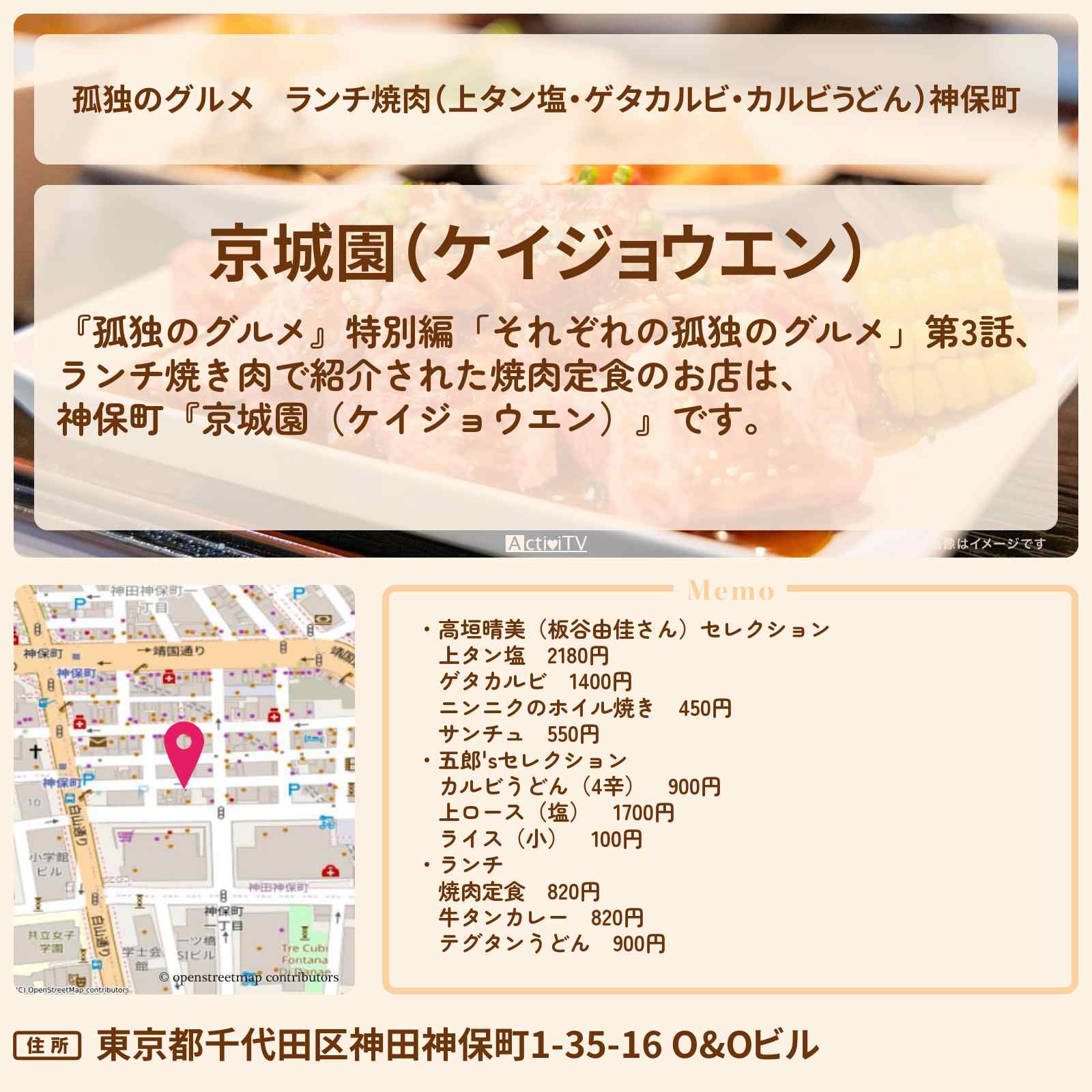放送の【孤独のグルメ】特別編「それぞれの孤独のグルメ」第3話、ランチ焼き肉で紹介された焼肉定食のお店は、神保町『京城園(ケイジョウエン)』です。