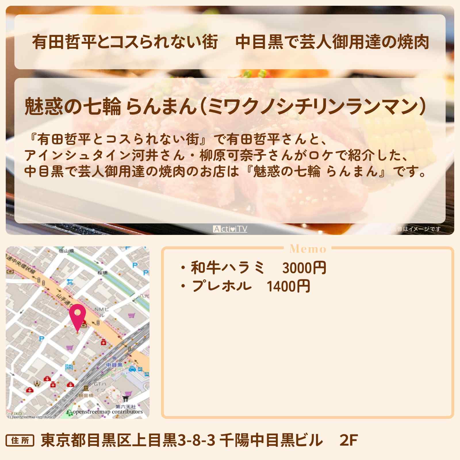 放送の【有田哲平とコスられない街】で有田哲平さんと、アインシュタイン河井さん・柳原可奈子さんがロケで紹介した、中目黒で芸人御用達の焼肉のお店は『魅惑の七輪 らんまん』です。