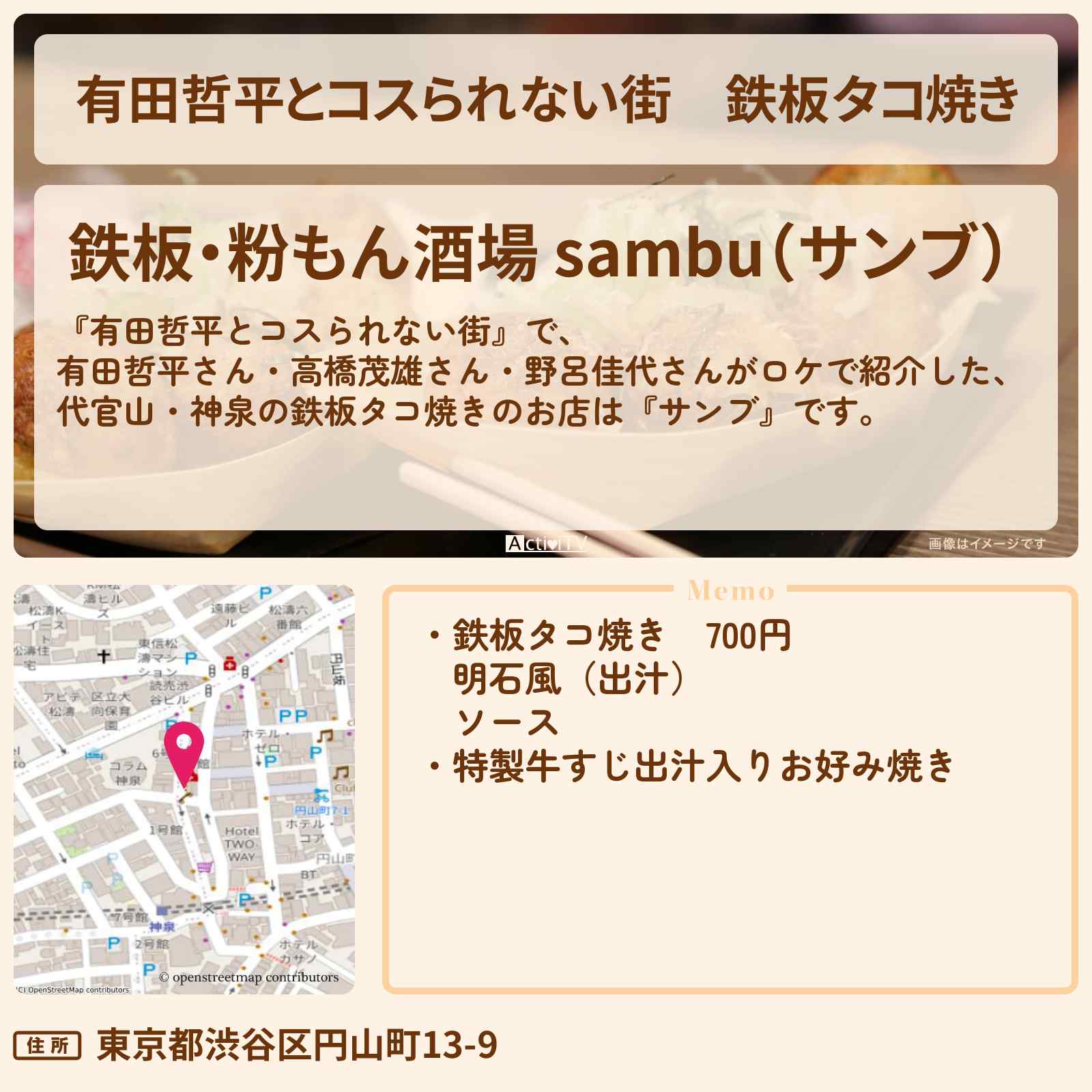 放送の【有田哲平とコスられない街】で、有田哲平さん・高橋茂雄さん・野呂佳代さんがロケで紹介した、代官山・神泉の鉄板タコ焼きのお店は『サンブ』です。